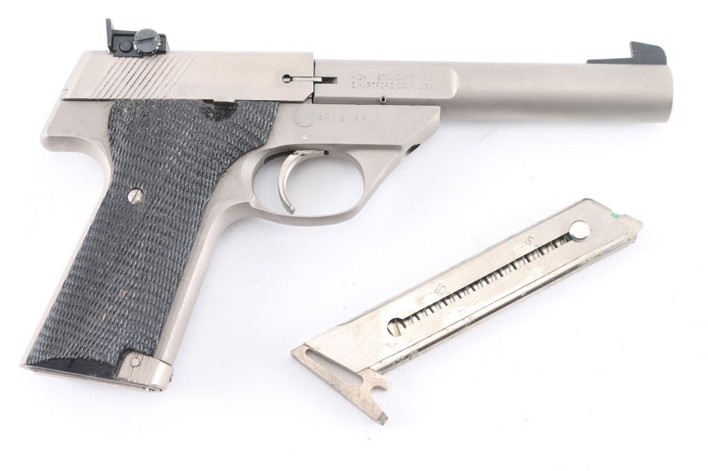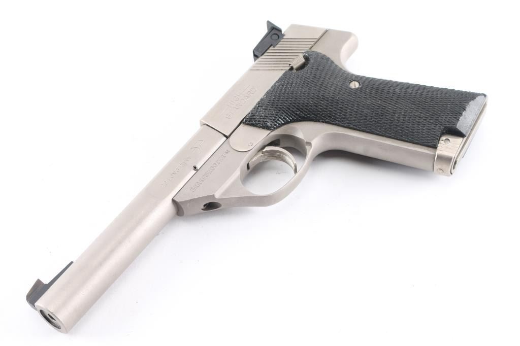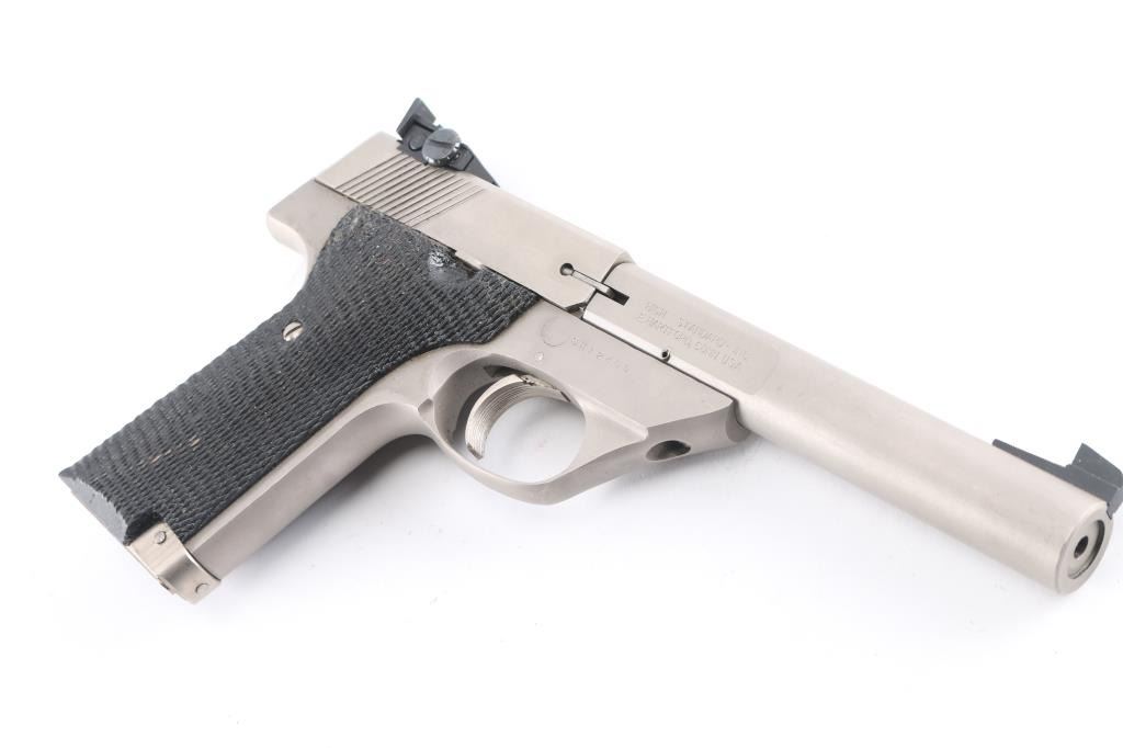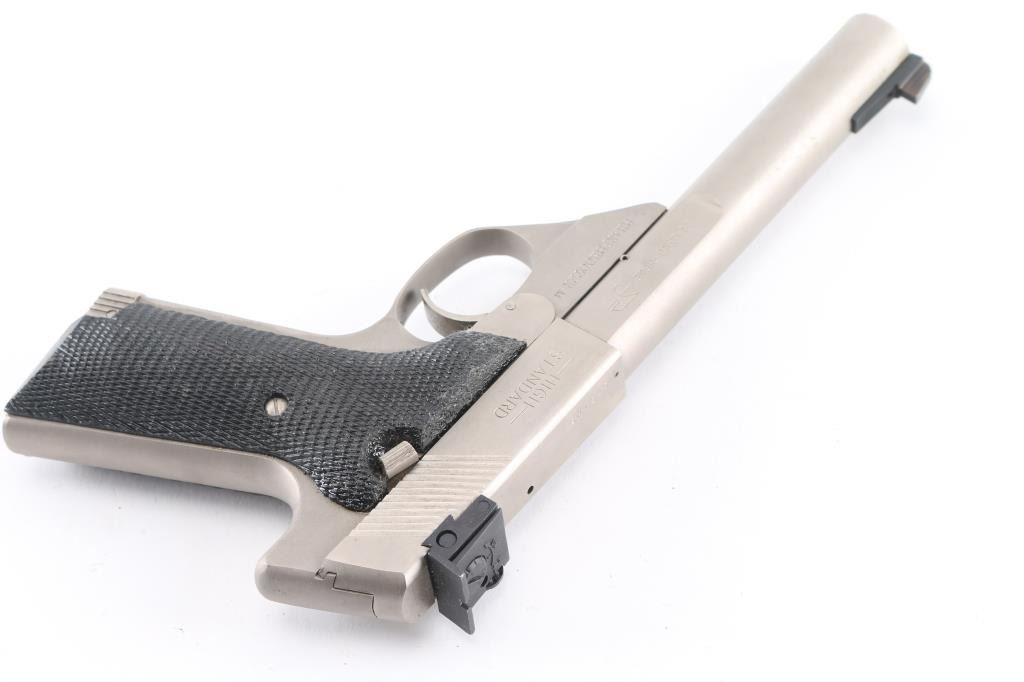 Semiautomatic rimfire pistol manufactured circa 1982. Features electroless nickel finish, black color finished checkered wood grips, 5.5" bull barrel with rear scalloped flats, adjustable sights, manual safety, toe magazine release. Bore is excellent. Shows few minor blemishes to the finish, some scratches to the grips. Includes two magazines.