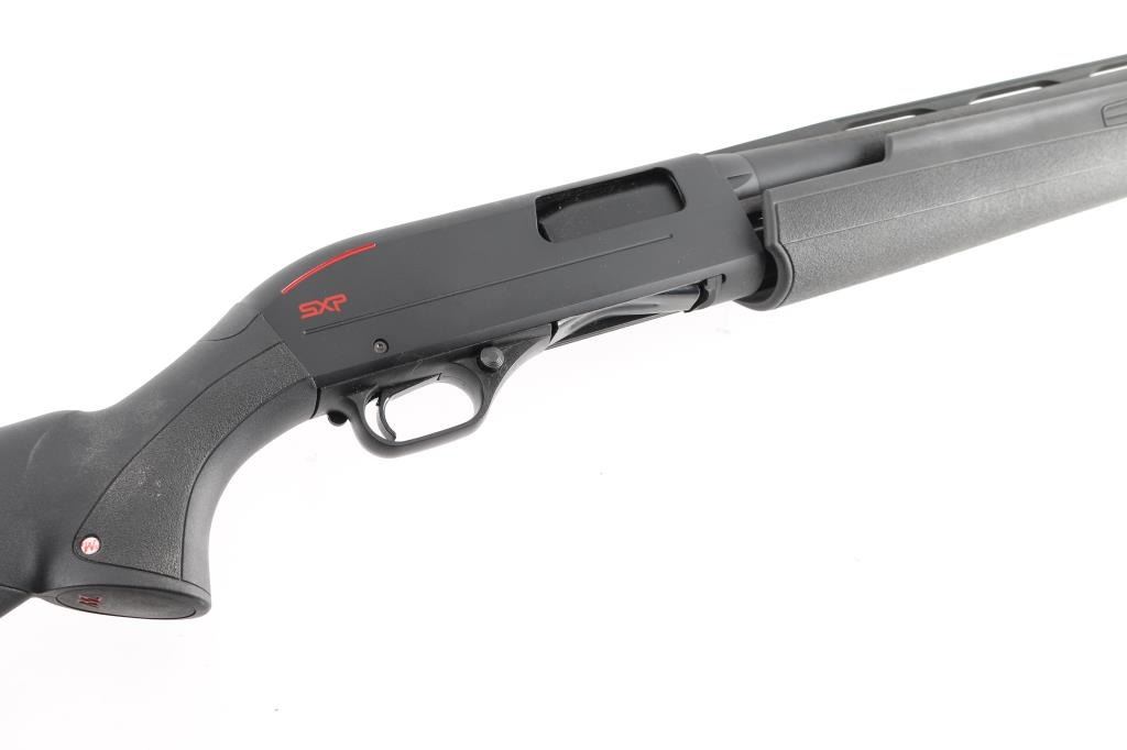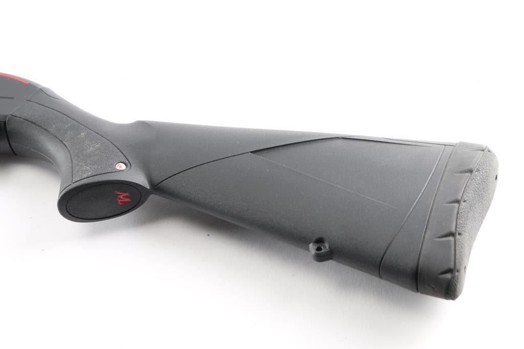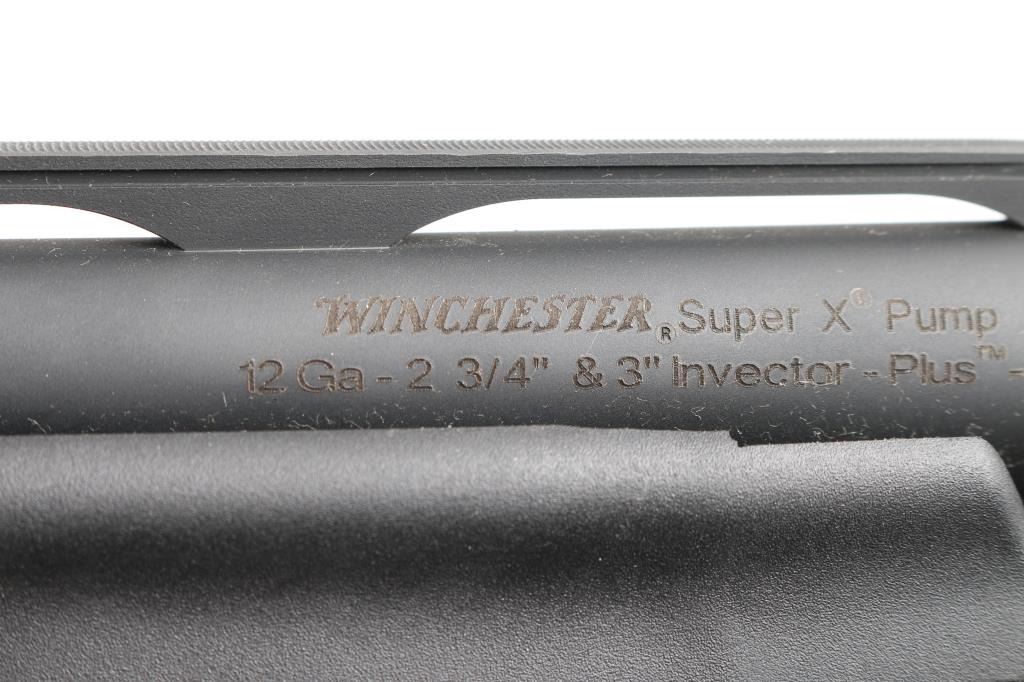 S/n: TR61685YMSXP. 12 Gauge Pump action shotgun made in Turkey for Browning Arms, Morgan UT. Features a black matte finish and polymer trigger guard, 28" serrated vented ribbed barrel, brass bead front sight, black polymer furniture, solid soft rubber recoil pad, push button safety. LOP is 13 3/4". Retains approximately 90% finish with a couple of small scrapes and marring on barrel/ top of receiver. Chamber is clean/shiny.