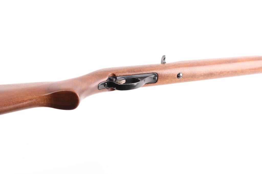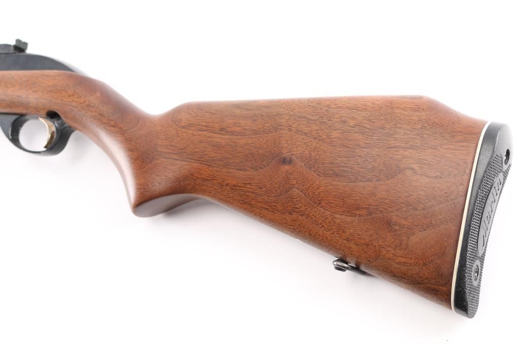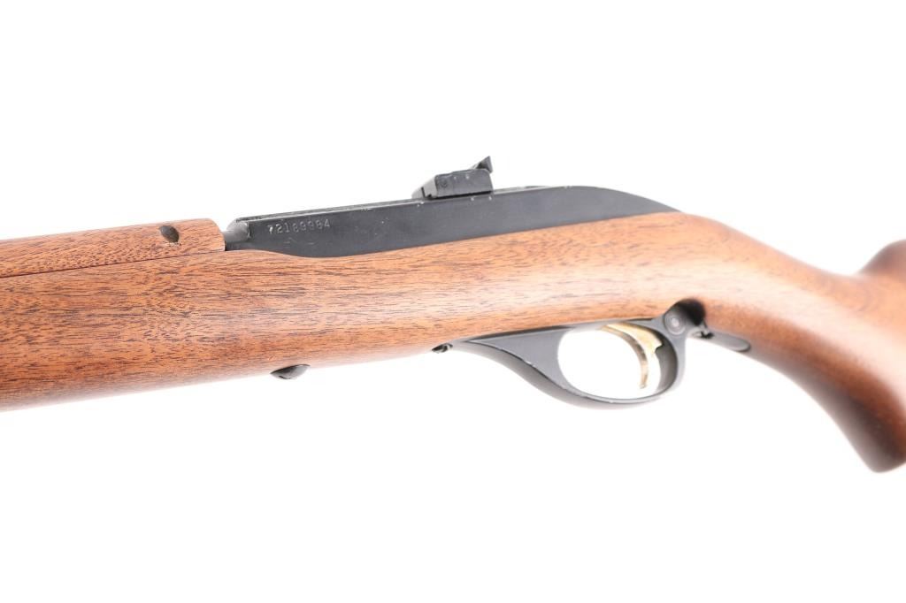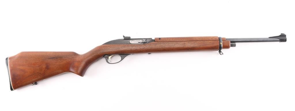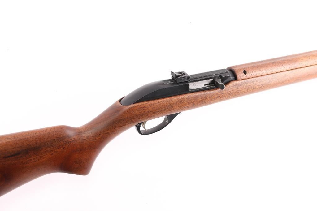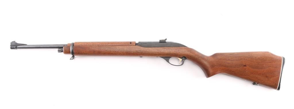Semiautomatic rimfire rifle for 22 long rifle only, manufactured circa 1972. Designed to mimic the overall look of the US M1 carbine. Features blued finish, black colored alloy receiver & triggerguard, smooth walnut stock & handguard, black plastic buttplate, 18" barrel, short magazine tube under barrel, blade front sight on barrel band, peep adjustable notch sight mounted to receiver groove, manual bolt hold open, push button safety, barrel band, sling swivels. Bore is very good condition. Retains 90% finish, edge losses to alloy parts. Wood is very good with few blemishes.