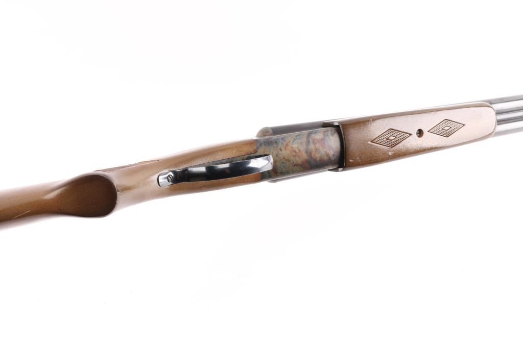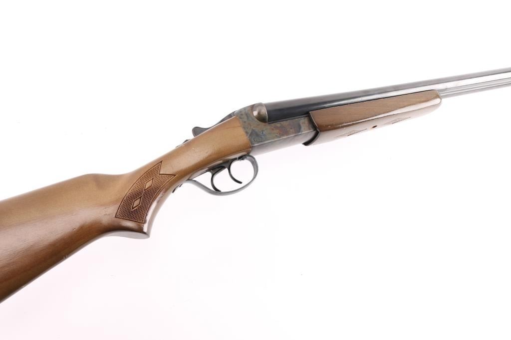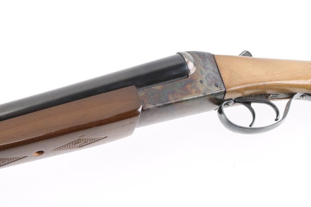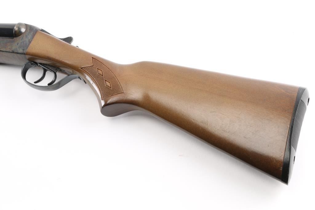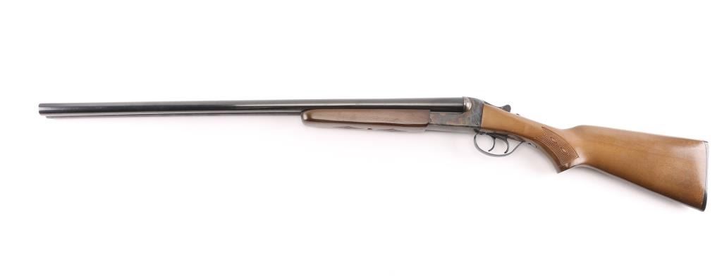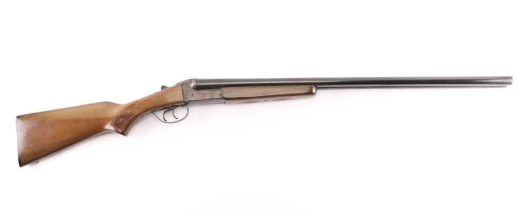 Double barrel SXS break-open 12 Gauge shotgun chambered for 2 3/4" & 3" shells. Features two 28" blued finish barrels with one steel bead front sight. Wood diamond checkered forearm and shoulder stock with a serrated black plastic butt cap. Color case-hardened box-lock receiver with tang safety and 2 curved triggers. Retains approximately 90% finish with faint pitting on top of right barrel at receiver. Wood is good overall with some nicks and small scratches. LOP is 14 1/4". Bores are clean and shiny.
