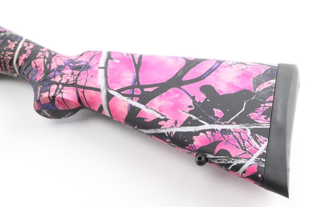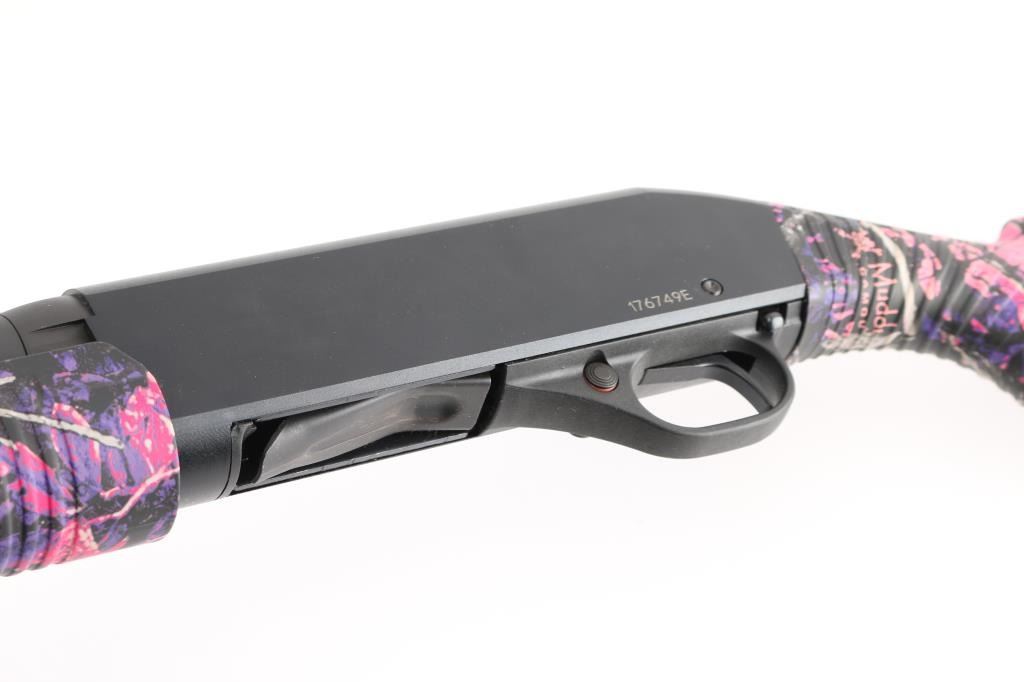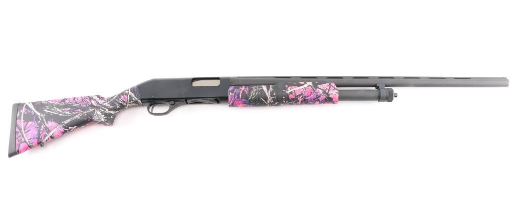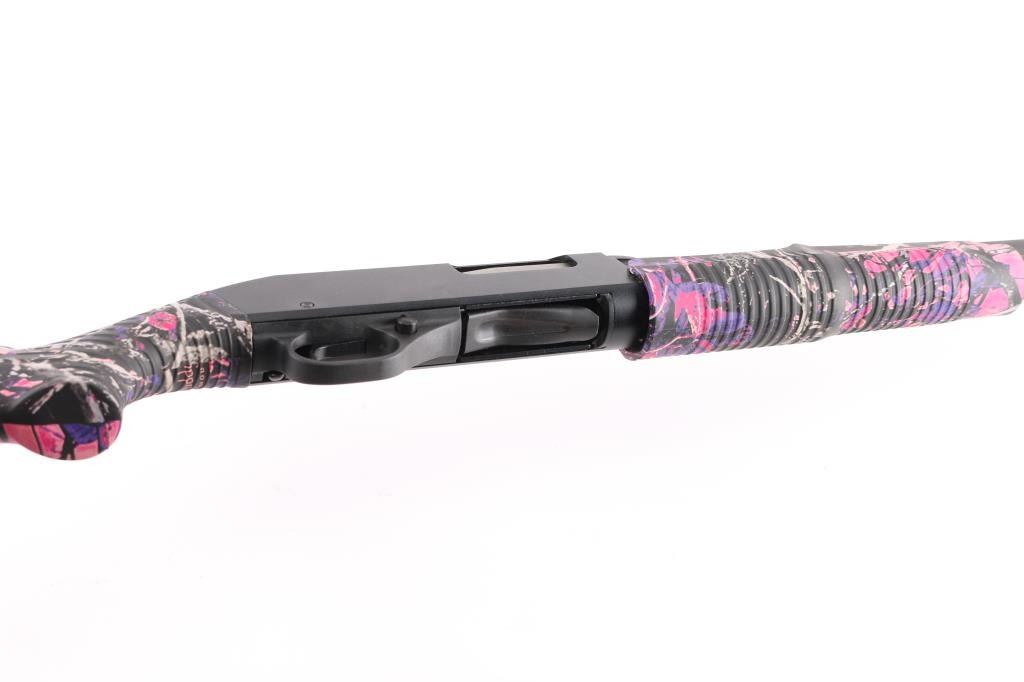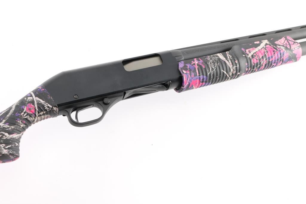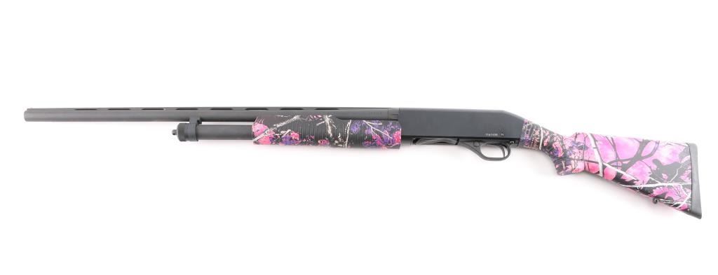 S/N: 176749E. Made in P. R.C. and imported by Savage Arms Inc. Westfield, MA. Pump action 20 Ga. shotgun and chambered for 2 3/4" & 3" shells. Features a 26" Parkerized serrated vent-ribbed barrel with a brass bead front sight, polymer serrated slide forearm and shoulder stock with a pink/purple/black-colored forest pattern wrap by Muddy Camo and a factory soft rubber buttpad. Has a smooth curved trigger and push button safety. LOP is 13 1/4". Retains approximately 95% finish with a small scratch on left side of barrel and some handling marks. Faint wear on magazine tube and action bars. Bore is clean and shiny. Action is smooth/tight. Comes with a IMPROVED MODIFIED choke tube installed.