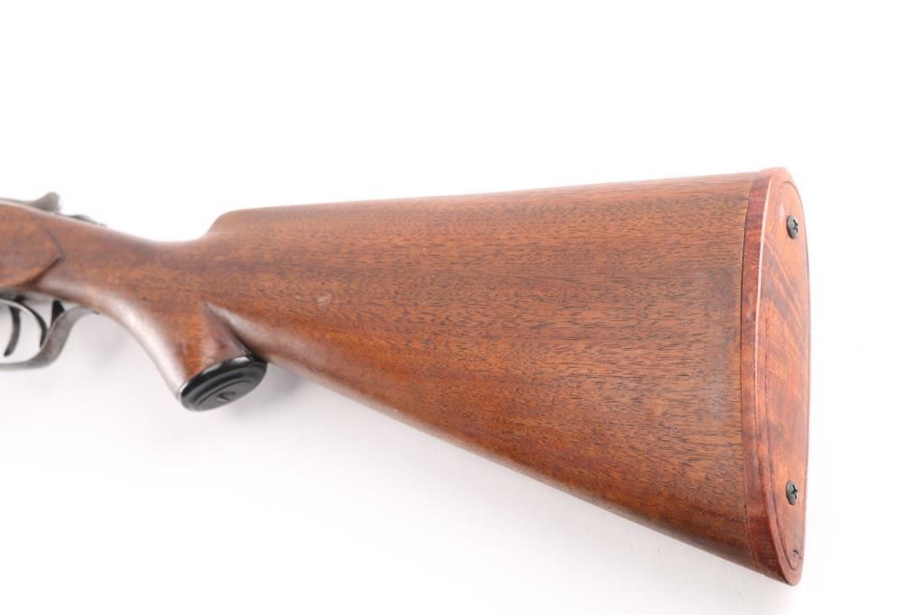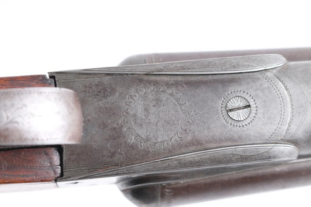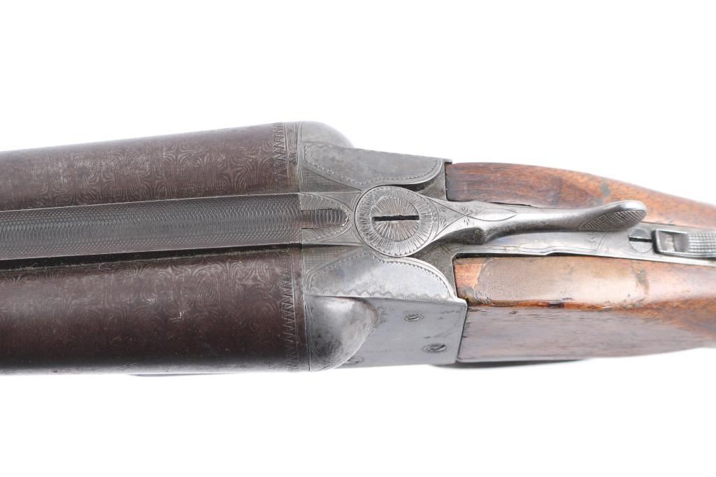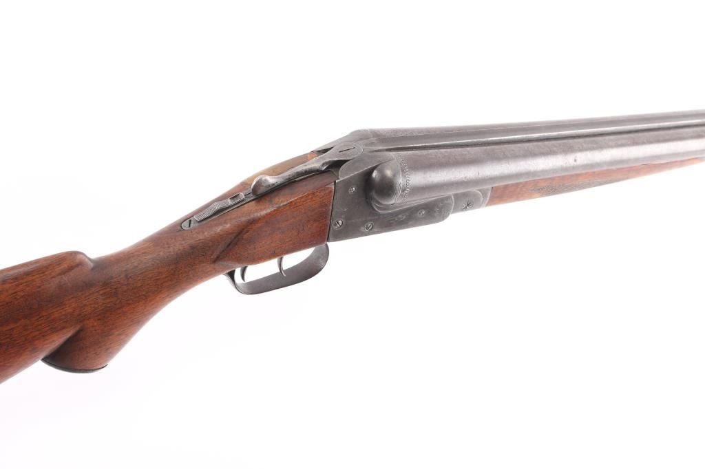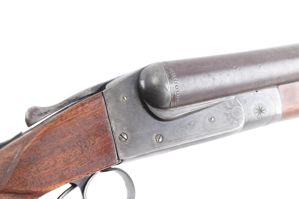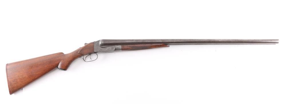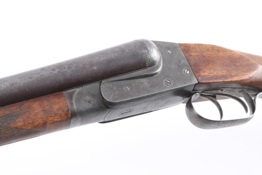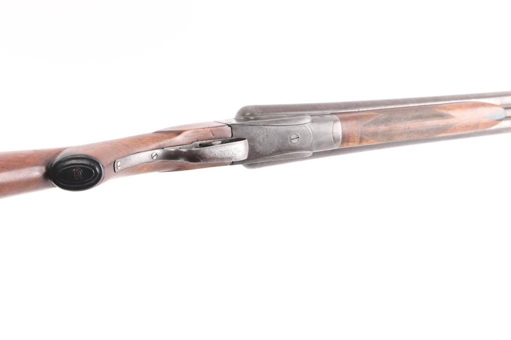 'Grade 2'. Manufactured in 1903. The 30" Damascus barrels have a single brass bead sight, are choked Full and have 3 inch chambers with an extractor. The receiver has some light engraving showing a snipe on the left side, a duck on the right side and a grouse on the bottom. Mounted on a multi-point checkered walnut forearm with contrasting tip and a pistol grip stock with a grip cap and a non factory wood butt plate. double triggers. Length of pull is 15" to front trigger. Barrels have turned a brown patina, the blue on the receiver is thin with handling loss, barrels lock-up tight, serial number on the lower tang is feint, the bores look very good, need cleaning, and the stocks are very good/sound.