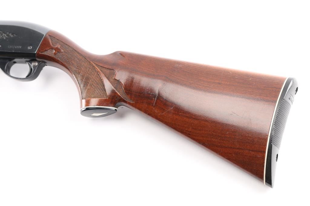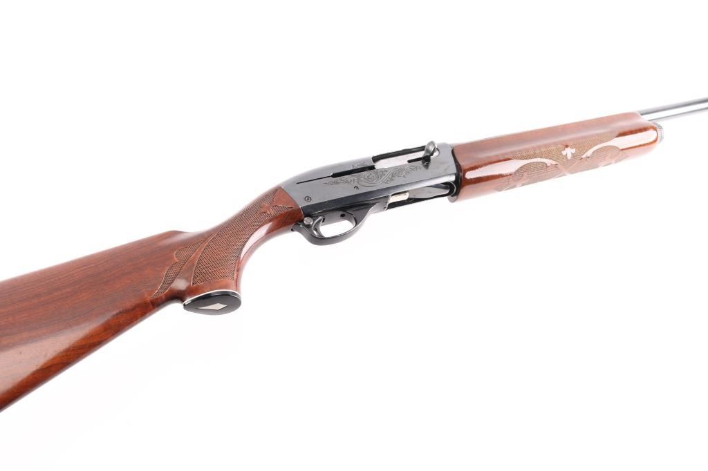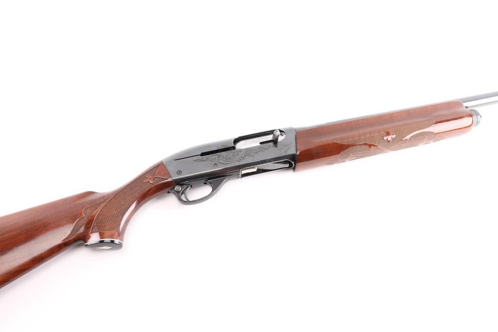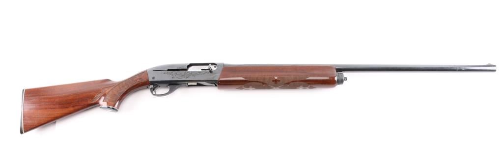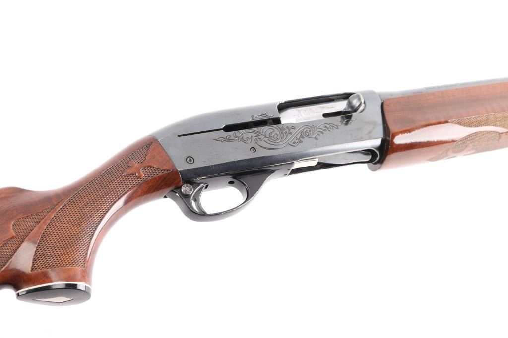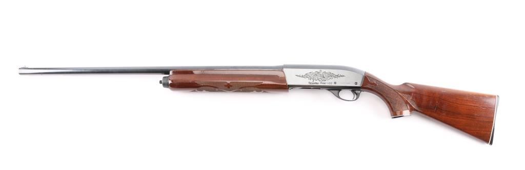 Gas operated semi-automatic 12 gauge shotgun chambered for 2 3/4" or shorter shells. Features a 28" blued finish fixed MODIFIED choke barrel with a brass bead front sight. Checkered wood forearm and shoulder stock with floral designs, black serrated plastic butt cap and a grip cap with a white diamond-shaped insert. Smooth curved trigger and push button safety. LOP is 14". Engraved floral design on both sides of receiver and bolt. Retains approximately 85% finish with a few scratches on the top receiver, trigger guard and faint pitting on top front half of barrel. Bore is clean and shiny.
