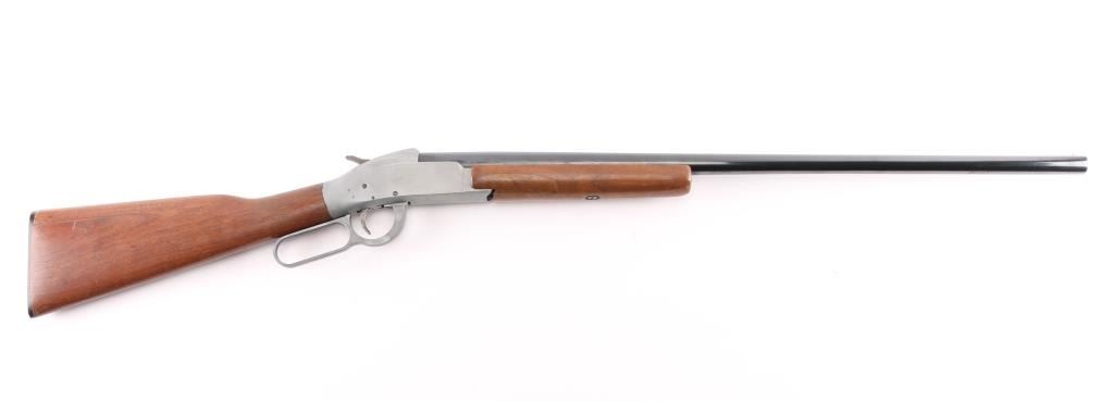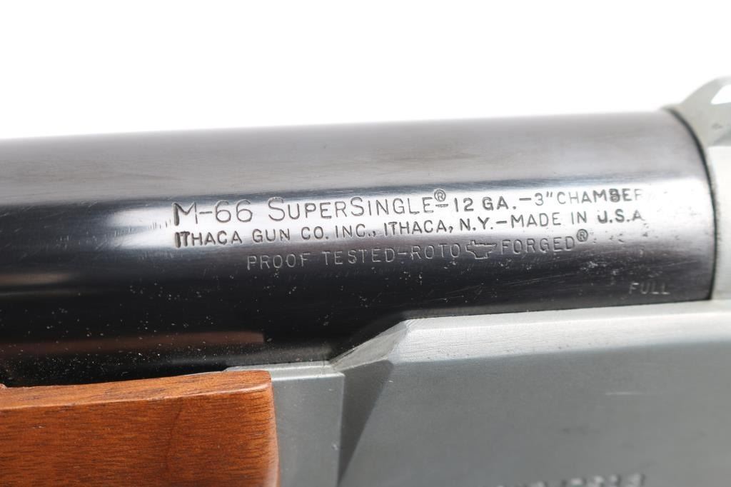 Ithaca Model 66 Super Single, 12 gauge single barrel shotgun, lever action. 28" Full choked barrel and 3" chamber. Silver sighting bead, smooth wood stock, & forearm, factory plastic buttplate. Produced 1963-1978,Bore & chambers look very good, but dirty, action lockes up tight, blued barrel is very good, the action,& lever have refinished in gray, covering some patches of light pitting.