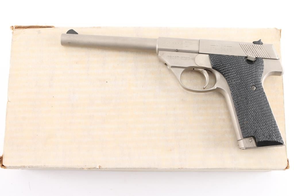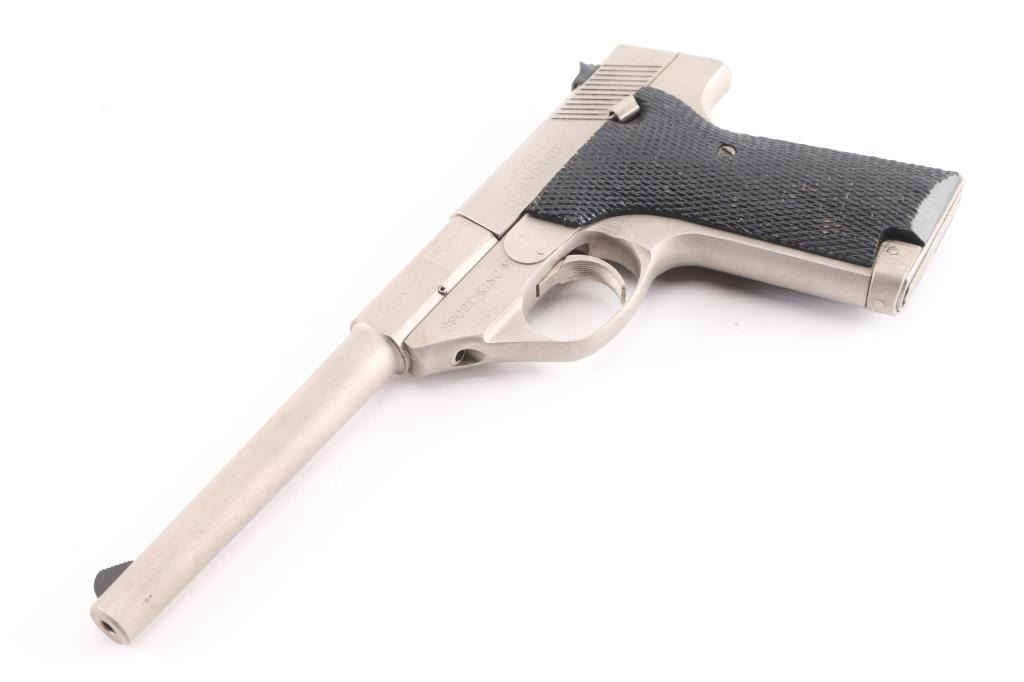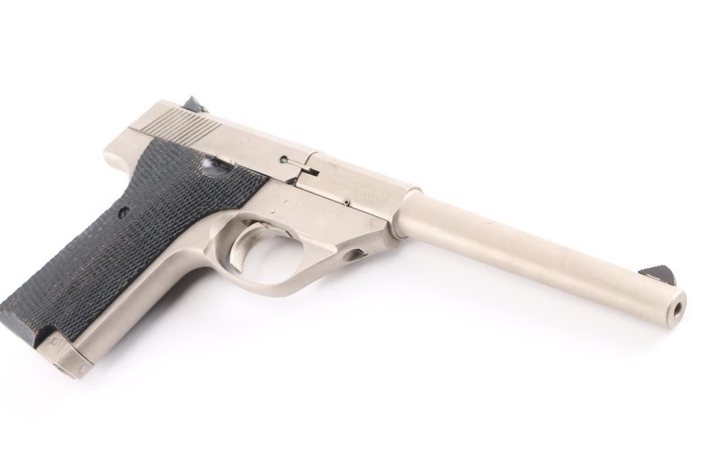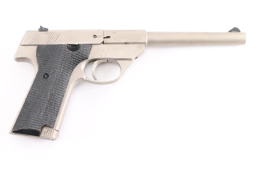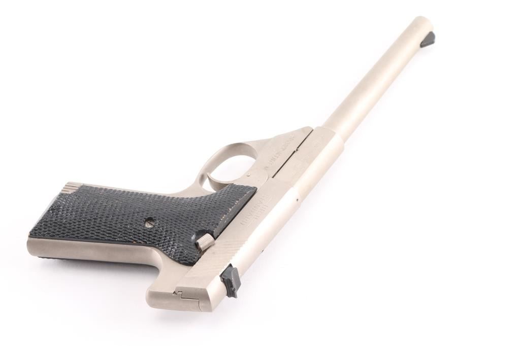 SN: SH28179V Semiautomatic rimfire pistol manufactured circa 1981-84. Features electroless nickel finish, black color finished checkered wood grips, 5.5" tapered heavy barrel, ramped front & dovetail mounted rear sights, manual safety, toe magazine release. Bore is very good. Shows few minor blemishes to the finish, some minor finish losses to the grips. Includes one magazine factory box with paperwork.