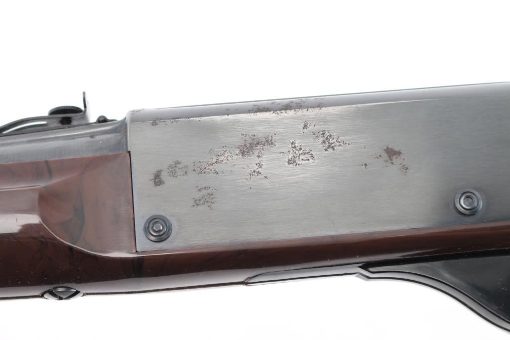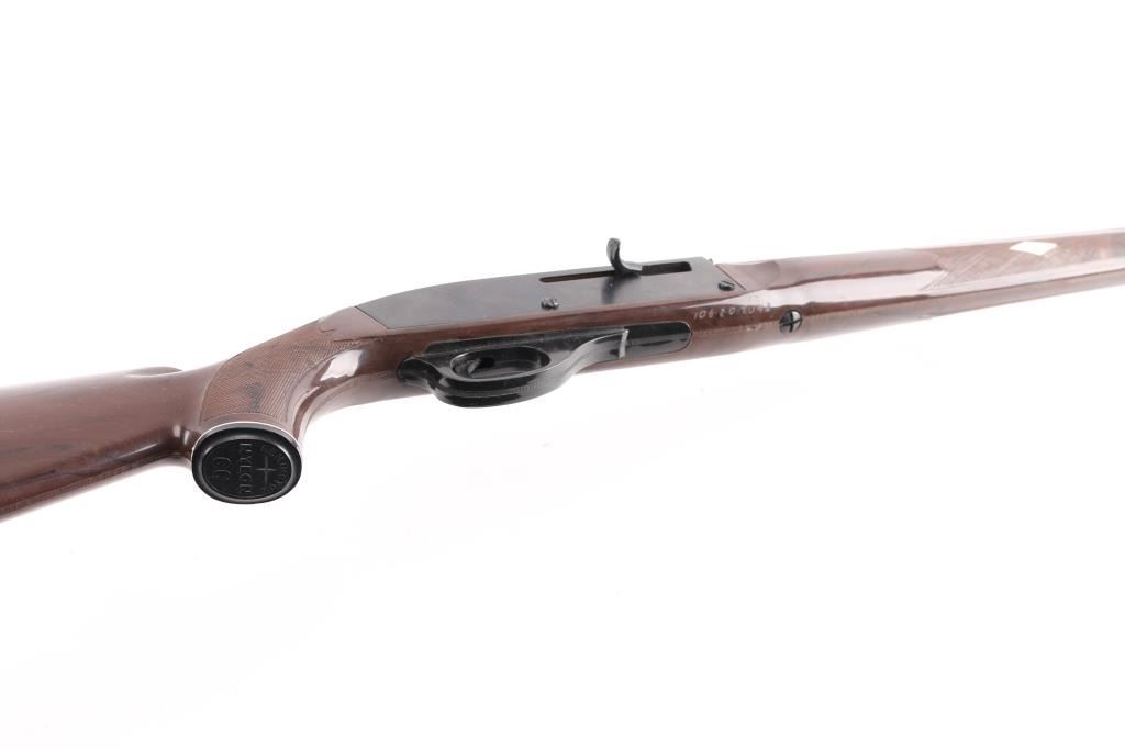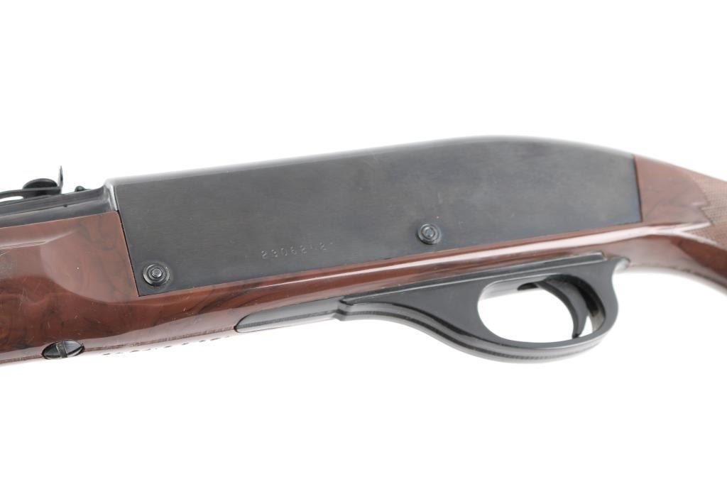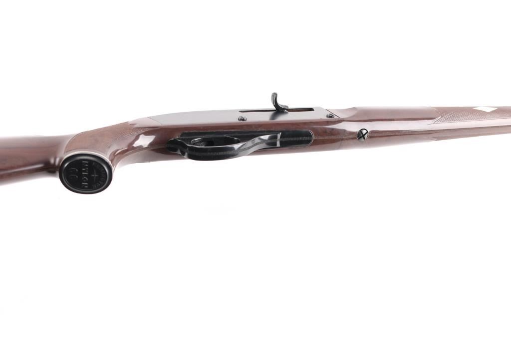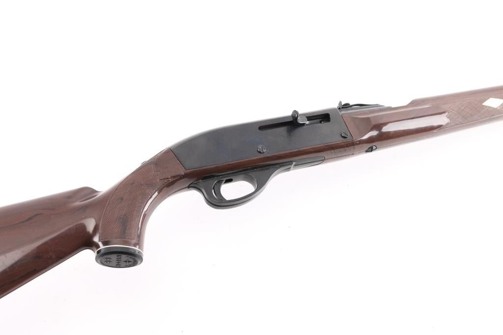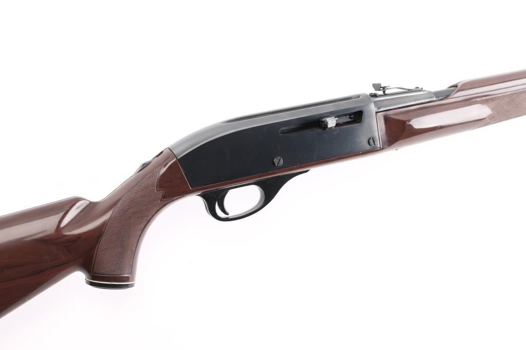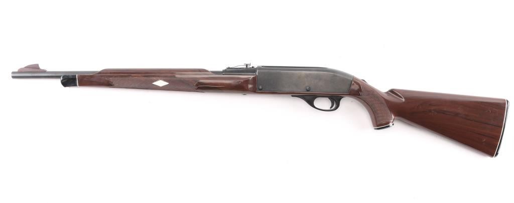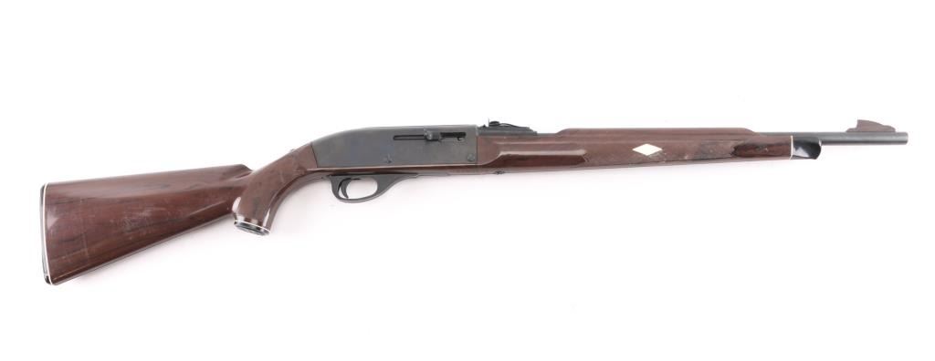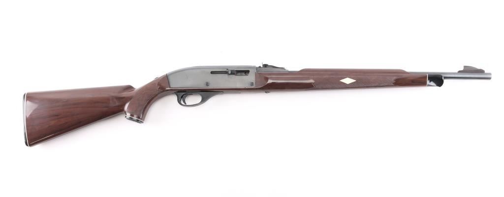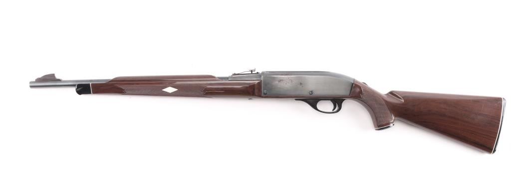 Semiautomatic rimfire rifle circa 1967-68, features blued finish, brown nylon/polymer stock, 19.5" barrel, large blade front sight, adjustable rear sights, manual safety, tube magazine in butt, grooved trigger, plastic trigger guard and integral scope base machined into receiver. Bore is very good and bright. 75% finish with patches of pitting on left side of receiver. Stock looks good with little to no cracks/scratches, grip cap is intact.
