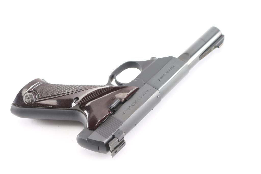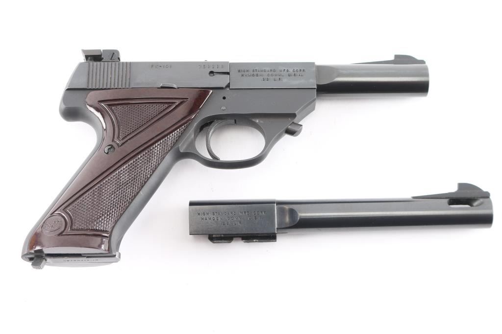 "FK-101" Two barrel set. Semiautomatic rimfire pistol manufactured circa 1951 - 1953. Features blued finish, checkered brown plastic grips (thumb rest for right handed shooter), 4.5" heavy round barrel with scalloped rear where barrel fits into shrouded breech, lever take-down, adjustable sights, manual safety, slide stop lever, heel magazine release. Bore is very good condition. Retains 90% blue, some bare metal on edges & corners, and at muzzle. Slide numbered to frame. Grips are pristine. Includes (1) magazine, additional 6.75" barrel, factory box (box lid corners damaged).