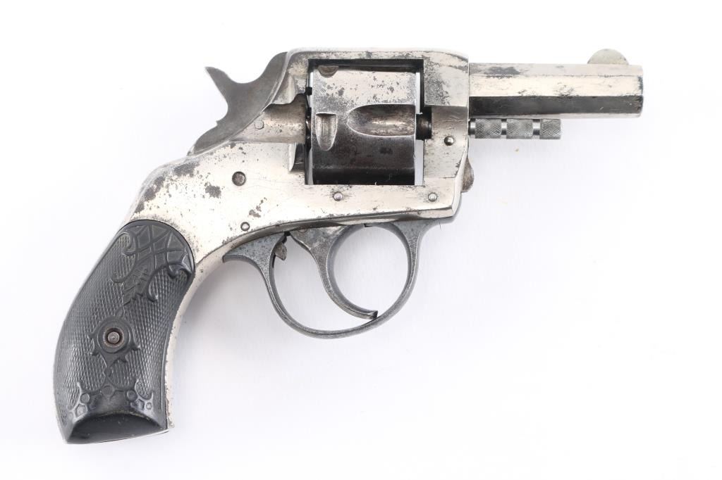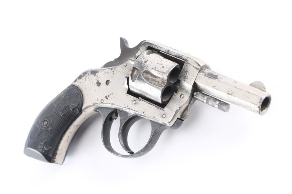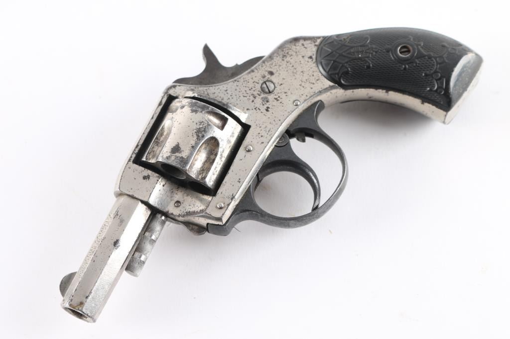 Vintage double action revolver features nickel finish, checkered black hard rubber grips, 2" octagon barrel, fixed sights, 5 shot fluted cylinder. Bore is very good/bright. Retains about 70% nickel with some flaking on the edges, some small areas of light pitting, some finish loss on the cylinder. Grips are very good. Blued trigger, hammer, and triggerguard are good with some handling loss. Action works well.