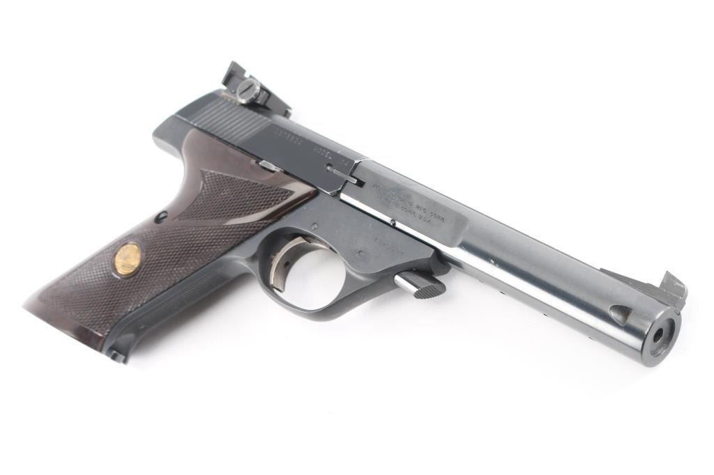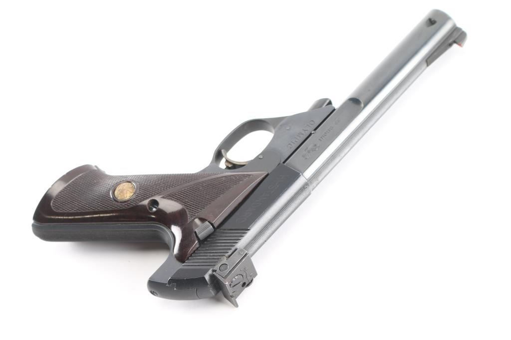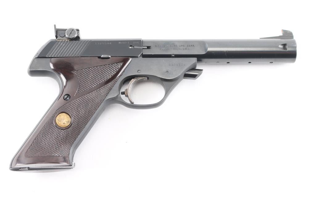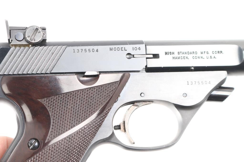 'Model 104' Semiautomatic rimfire pistol features blued finish, checkered brown plastic grips with slight thumb rest depressions and High Standard logo medallions, 5.5" bull barrel with square rear portion, drilled & tapped for barrel weights, partridge front & adjustable rear sights, manual safety, heel magazine release. Bore is very good condition. Retains 95% finish with light edge losses & handling marks. Grips are very good. Slide numbered to frame. Includes one magazine.