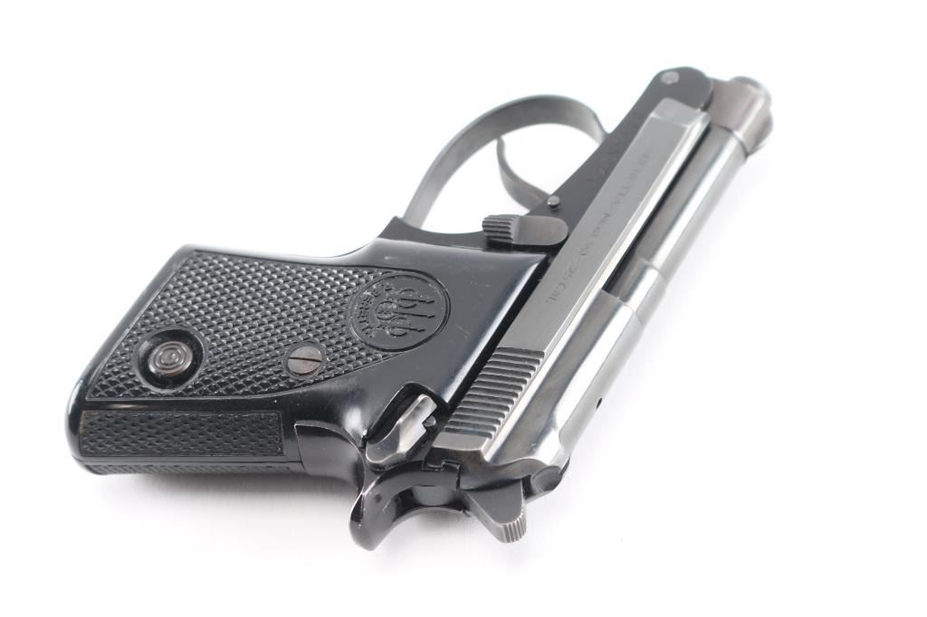 Double action semi-automatic pocket pistol, made int the USA. Features a blued finish, approx 2.3" tip-up barrel, fixed sights, smooth trigger, serrated hammer spur, push button magazine release, manual safety, two piece checkered plastic grips with embossed Beretta logos. Bore is very good condition. Retains 90% finish with handling marks, edge wear, small area of pinpricking on trigger bar. Some parts have slightly plum color bluing. Grips are fine. Includes "Bulldog" pocket sleeve holster, one magazine.
