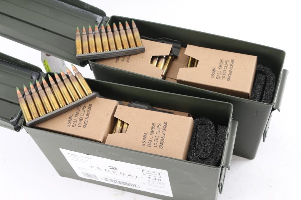 Approx. 840 rounds of 5.56 X 45mm factory new ammunition. Federal, 62 Gr. FMJ XM855LC1, 10 rd stripper clips, 3 clips per box, 28 boxes all in 2 metal ammo cans.