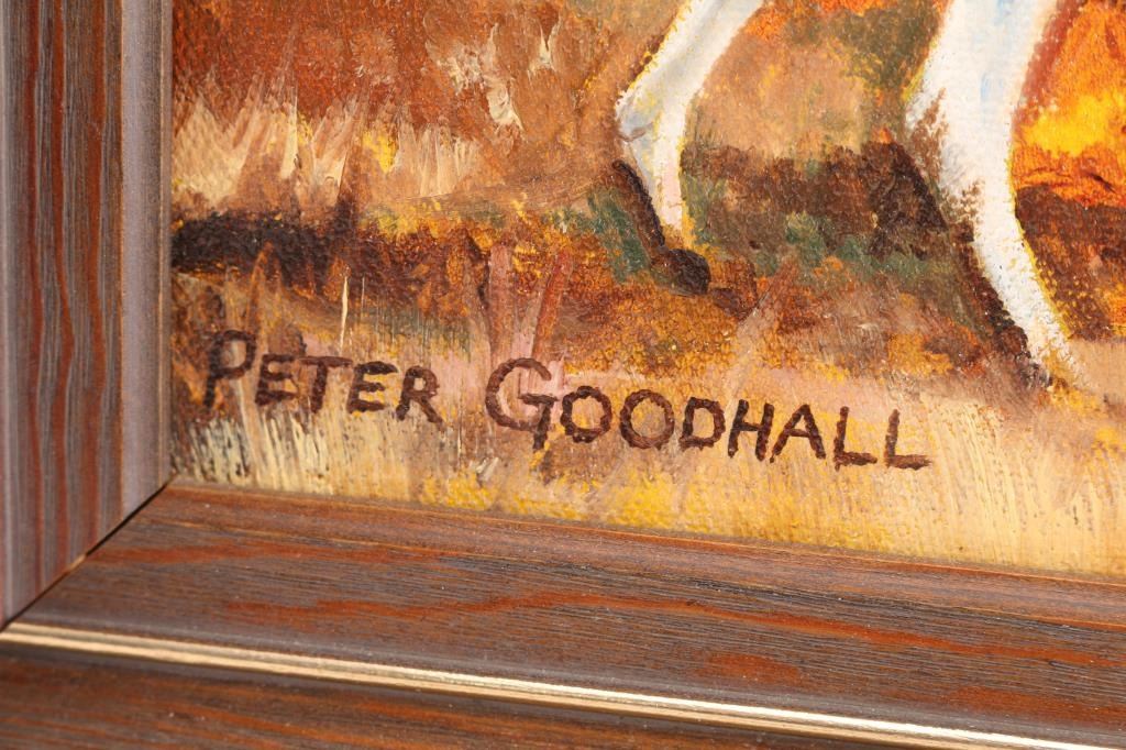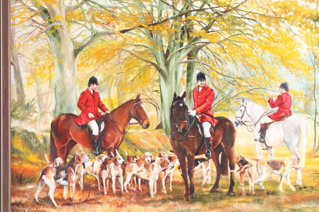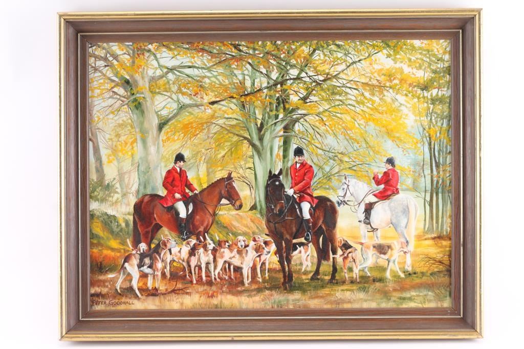 by Peter Goodhall depicts an English hunting scene. Signed lower left-hand corner, in wood and gold frame. Measures 231/2" x 17"