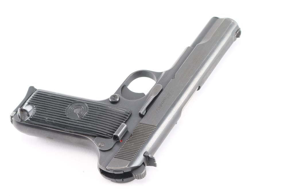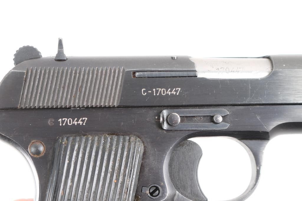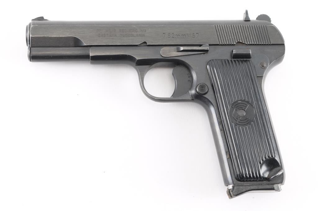 Yugoslavian military pistol imported by PW Arms, Redmond WA. Tokarev type pistol with slightly longer frame, takes a longer magazine that standard TT-33's. Features approx 4.5" barrel, fixed sights, detachable magazine, magazine safety, frame mounted manual safety, grooved plastic grips with "SFRJ" star on one side & "CZ" logo on other, lanyard loop, single action trigger. Bore is very good condition. Finish is blued with 95% coverage, some scratches and scuffs. Appears to be factory reblue, with some blemishes under the re-finish. Black plastic grips in very good condition. Observed numbers match. Includes one magazine, appears to be a stainless body, metal finger rest base is damaged.