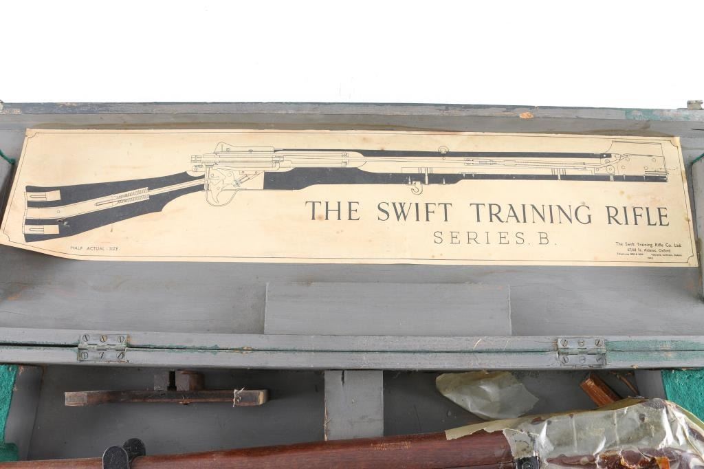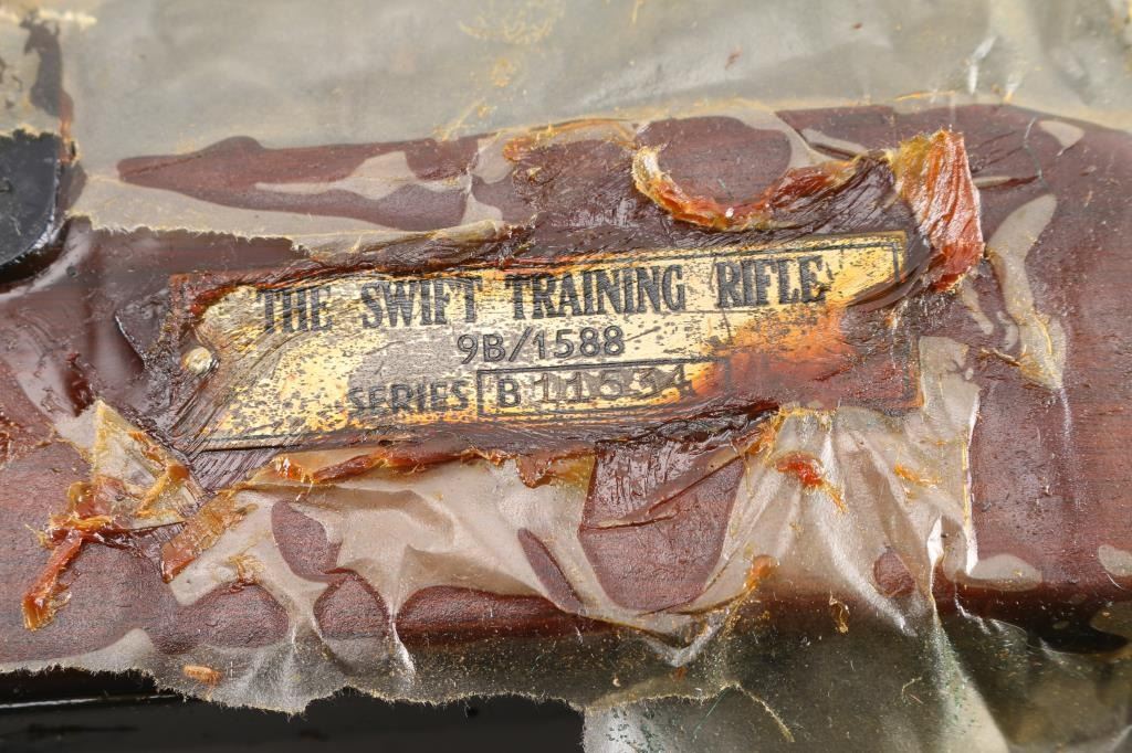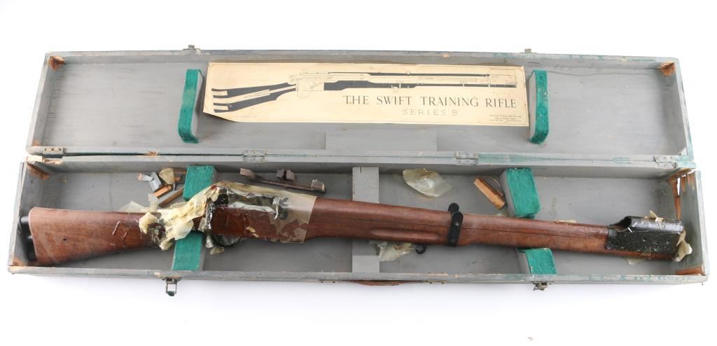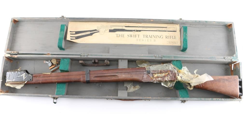 Series B. British military No 4 pattern bolt action training rifle developed in the 1940's to assist with the fundamentals of marksmanship. The rifle works with a series of 'safeties' that train the proper use of an Enfield rifle and uses a paper target with a protruding needle that lines up with the sight and pokes a corresponding hole in the target. Includes a wood transit case, with large label. The plaque on the rifle reads THE SWIFT TRAINING RIFLE"/9B/1588 & "Series B-11534." In near excellent condition. Receiver, and muzzle factory wrapped with heavy coat of cosmoline. Transit case has damage on the sides.