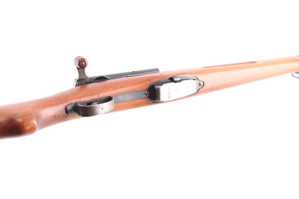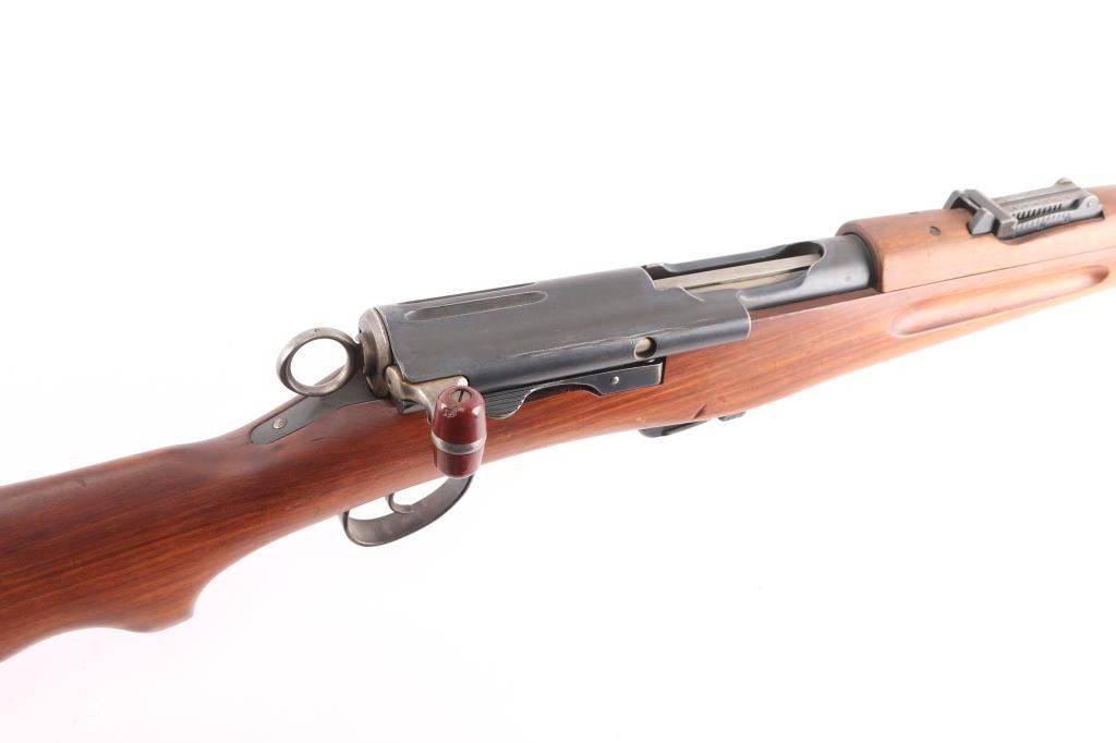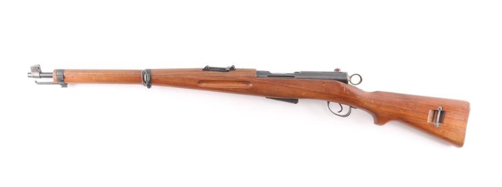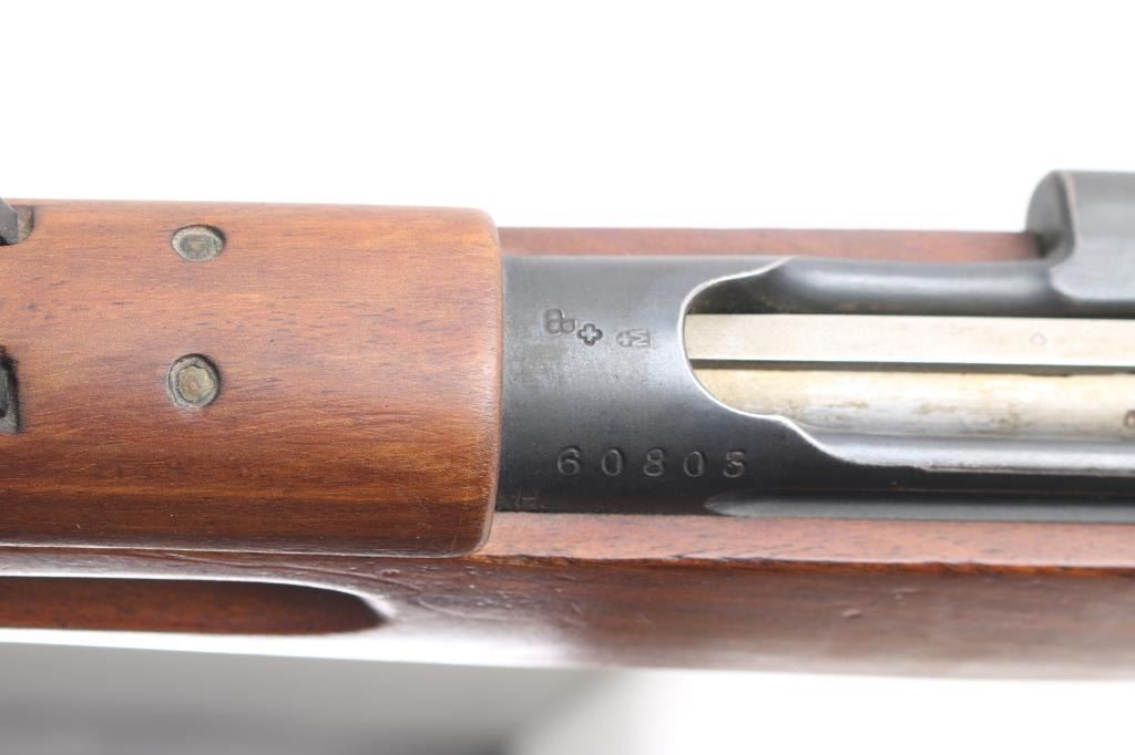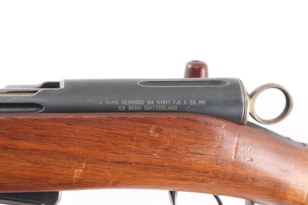 SN: 60803.Swiss military straight pull bolt action carbine features blued finish, wood semi pistol grip stock, 23 1/4" barrel, bayonet lug, stacking hook, blade front sight inside protective ears, tangent rear sight, side sling swivels, detachable magazine, manual safety, "beer barrel" bolt knob. Bore is excellent/bright condition. Retains 85% coverage of blued finish, showing edge losses & handling loss to the floorplate, & barrel. Bolt assembly is bright polished, overall in very good condition. Stock is very good condition, with minor dents and scratches. Bolt and magazine numbered to receiver. PW Arms importer marks on left receiver. Action is smooth.