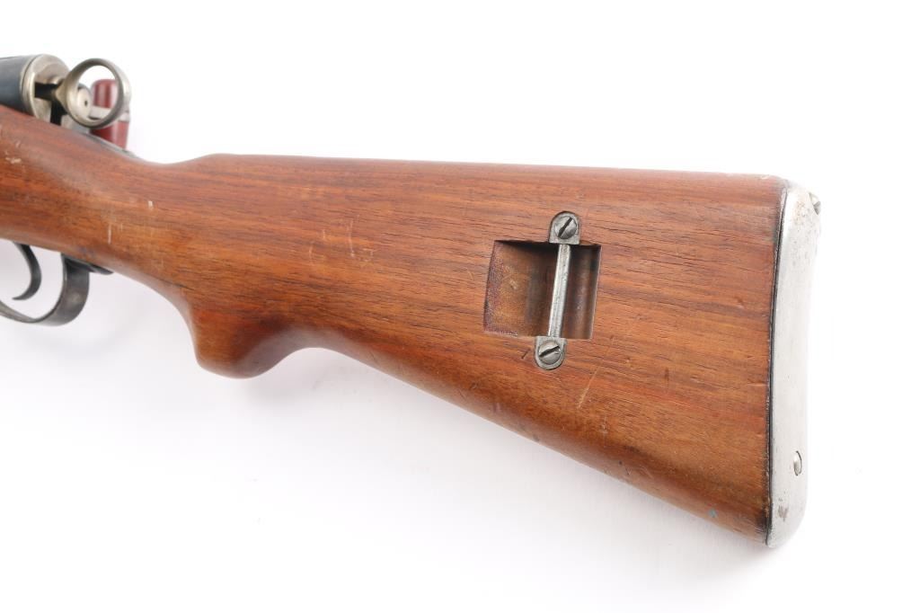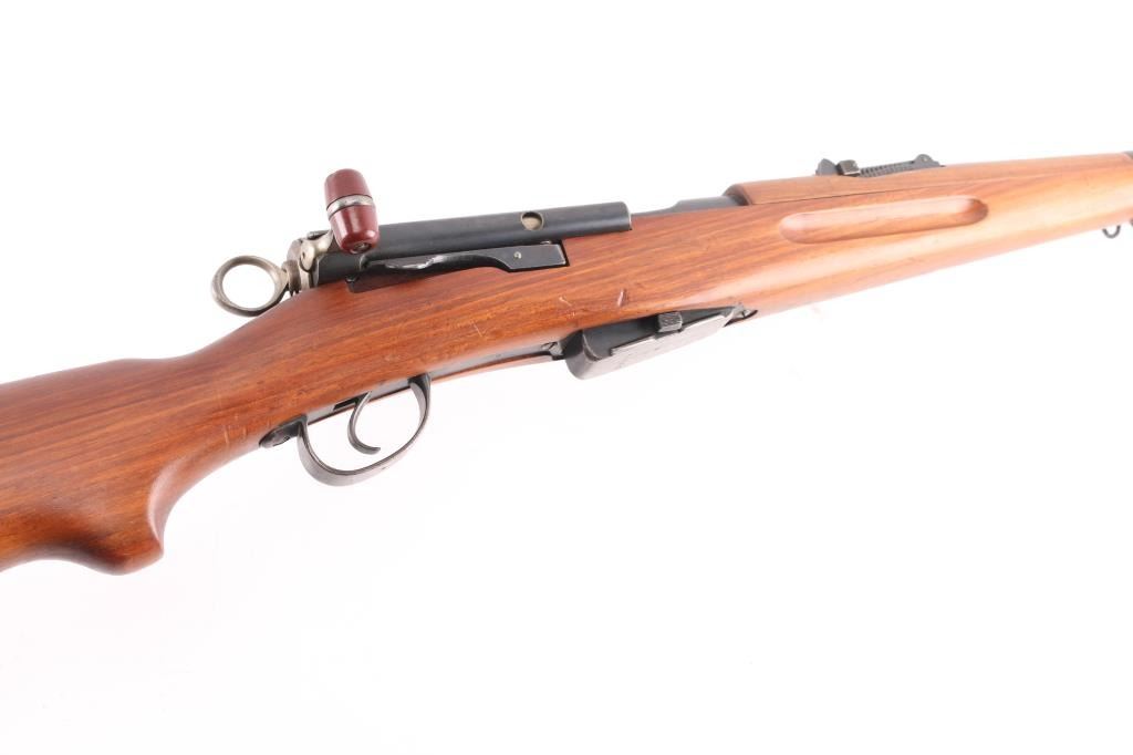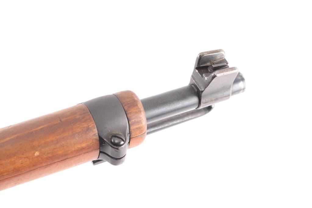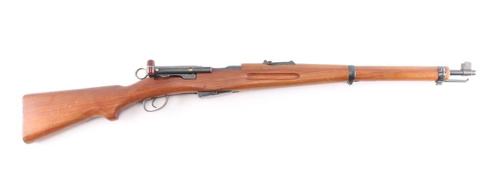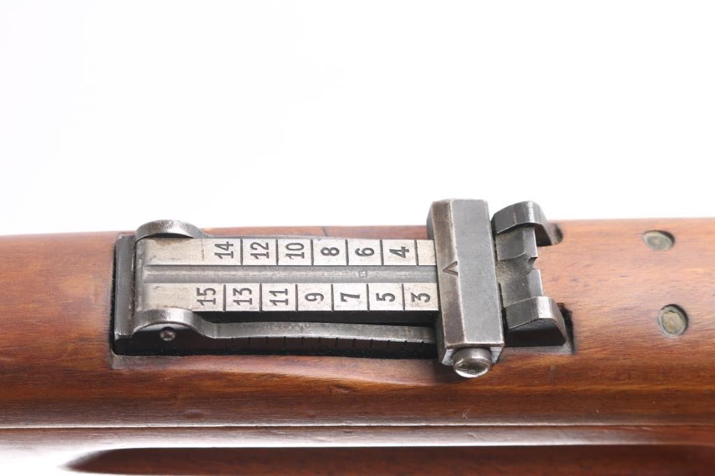 SN: 60803.Swiss military straight pull bolt action carbine features blued finish, wood semi pistol grip stock, 23 1/4" barrel, bayonet lug, stacking hook, blade front sight inside protective ears, tangent rear sight, side sling swivels, detachable magazine, manual safety, "beer barrel" bolt knob. Bore is excellent/bright condition. Retains 85% coverage of blued finish, showing edge losses & handling loss to the floorplate, & barrel. Bolt assembly is bright polished, overall in very good condition. Stock is very good condition, with minor dents and scratches. Bolt and magazine numbered to receiver. PW Arms importer marks on left receiver. Action is smooth.