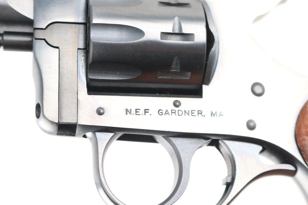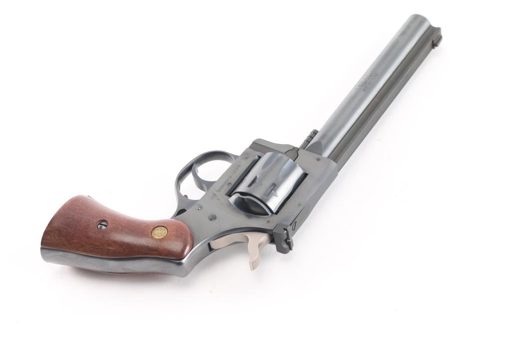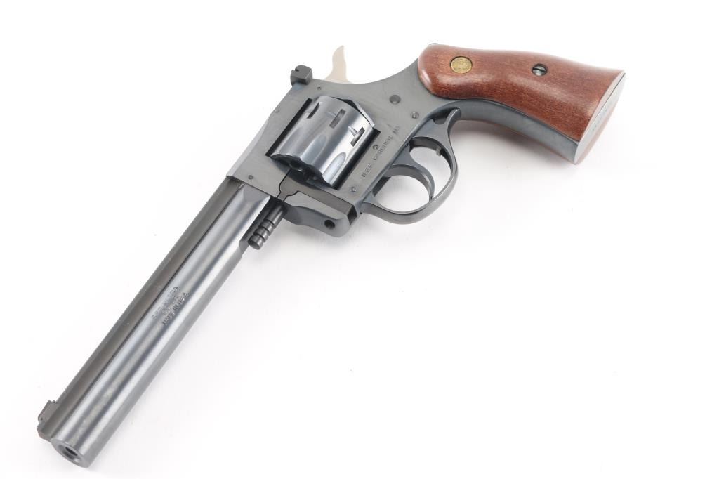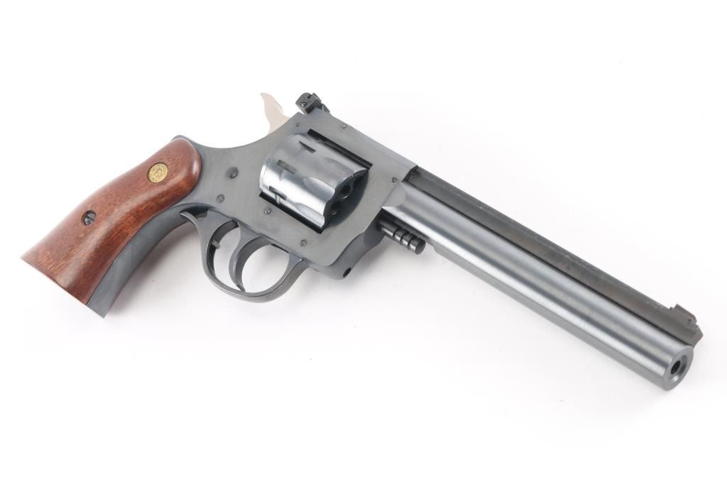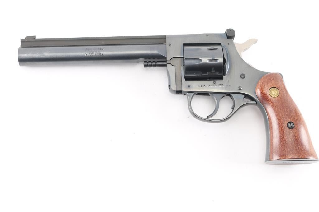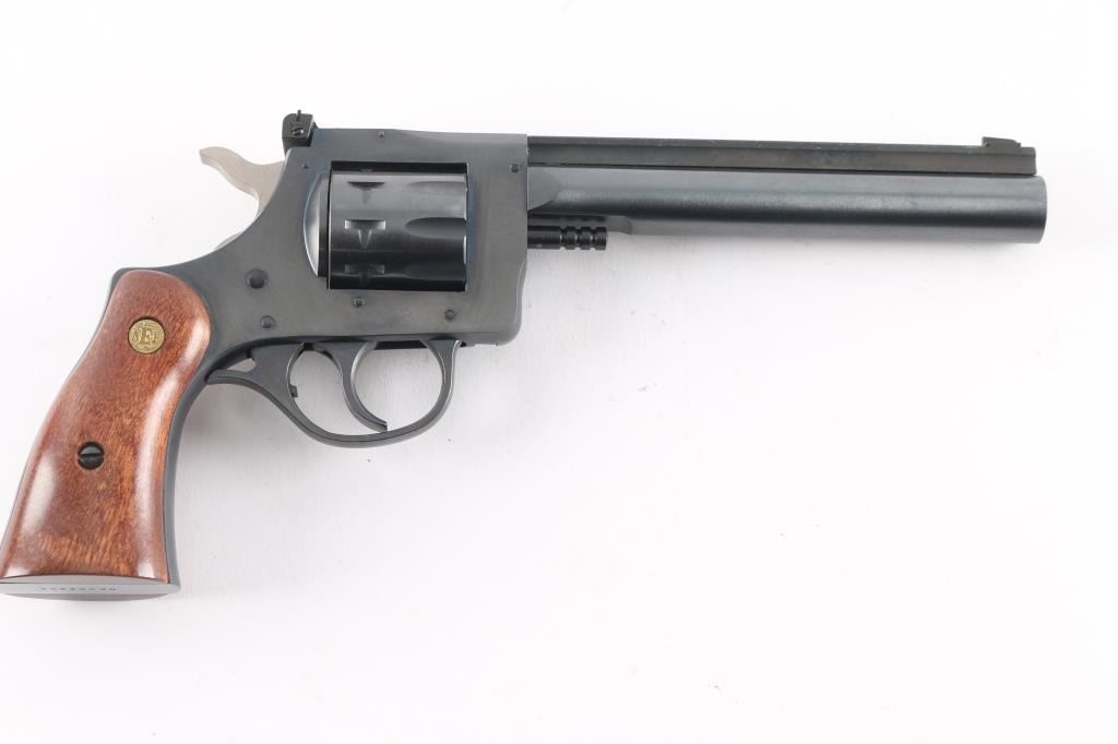 This is a New England Firearms R92 Ultra revolver chambered in 22 Long Rifle. It features a 6-inch barrel with raised, serrated sighting rib, 9-round swing-out cylinder, adjustable rear sight, double action only trigger, blued finish, smooth wood grips with NEF medallions. Includes factory box with matching label, and instruction manual. Overall, this R92 is in like new condition. Bore is pristine, action is crisp/tight, and the grips, and metal finish are excellent. Manufactured 1996.