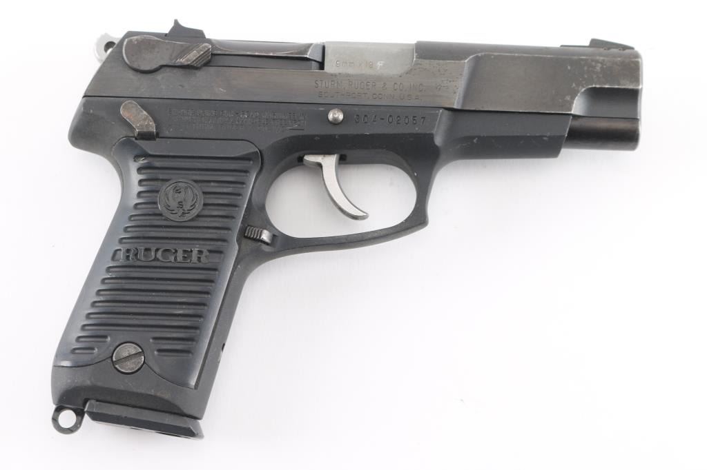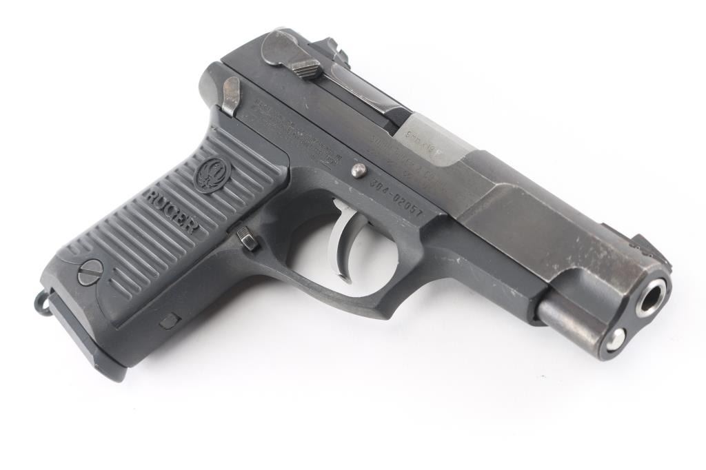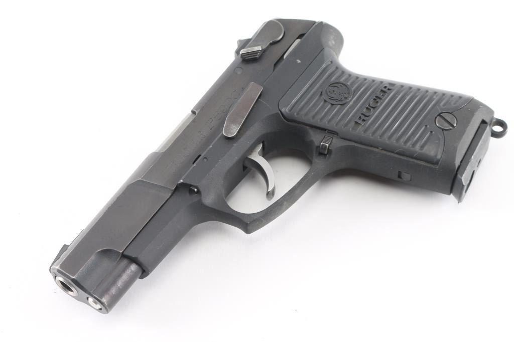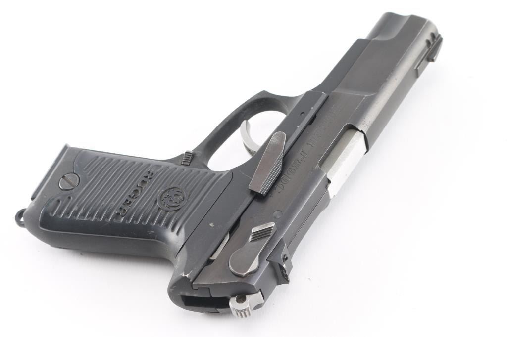 Semiautomatic pistol features blued steel slide over dark gray parkerized aluminum alloy frame, Ruger black plastic grips, double/single action, approx 4.5" barrel, decocker levers on both sides of slide, 3 dot sights (rear is adjustable for windage), lanyard stud at butt, 10 round magazine. Bore is excellent/bright. Retains 85% finish, with edge losses, handling marks. Grips are very good.