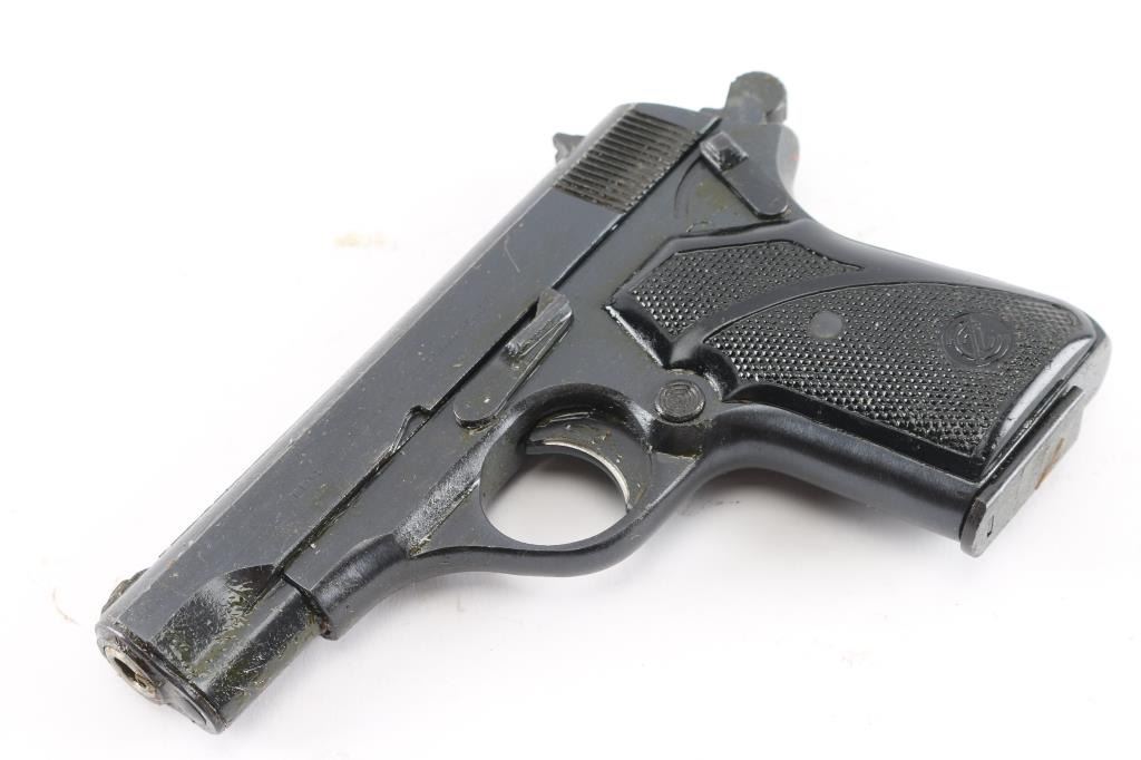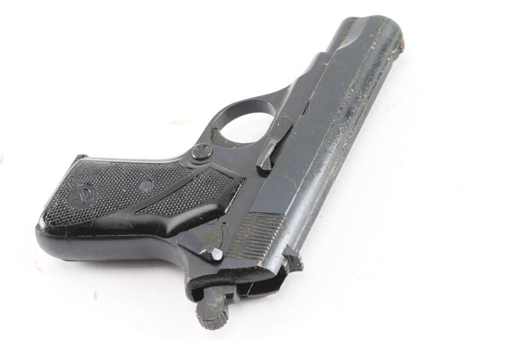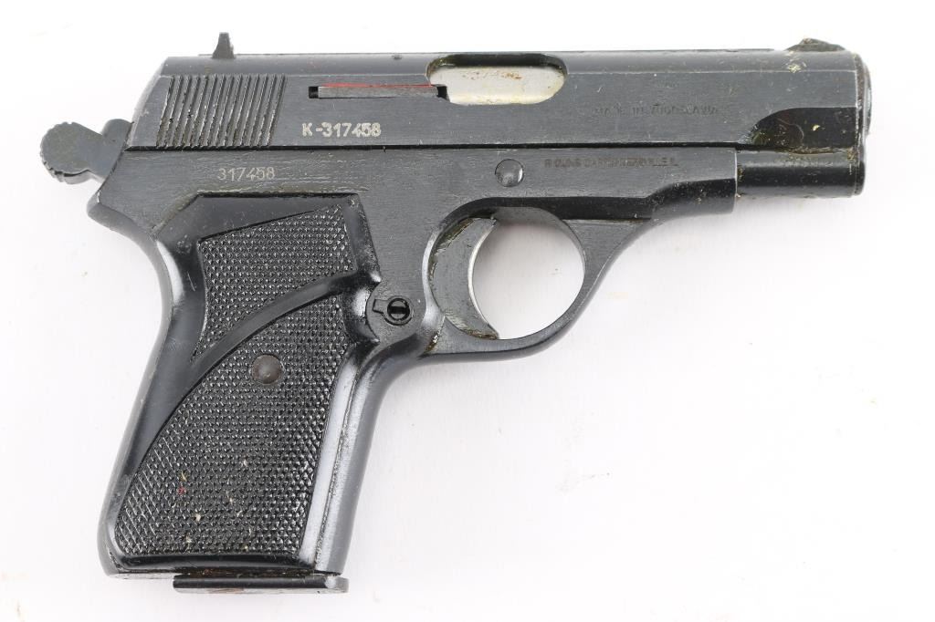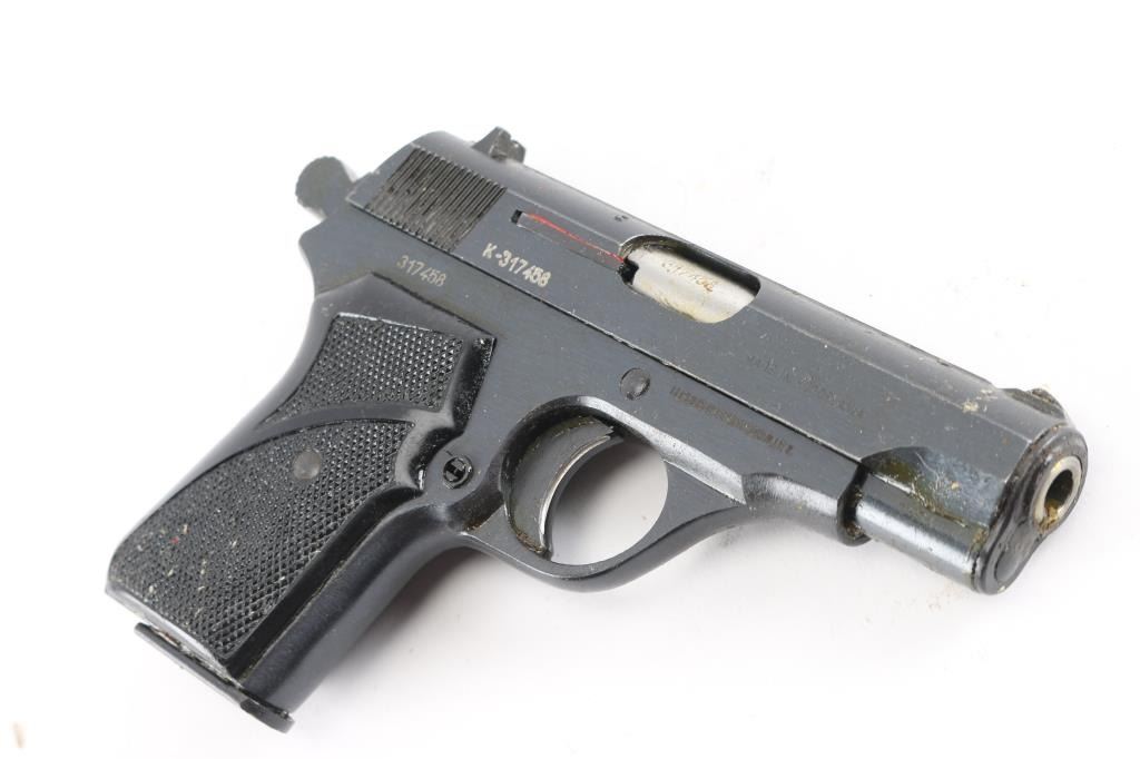 Yugoslavian compact pistol imported by R Guns, Carpentersville IL. Features 3.5" barrel, fixed sights, single action trigger, manual safety, magazine safety, push button mag release, blued finish, checkered black plastic grips. Pistol is covered in a thick layer of sticky preservative grease, making inspection difficult. Bore appears very good. Retains 95% or better finish with minor dings or other blemishes from storage. Grips are very good. Includes one magazine.