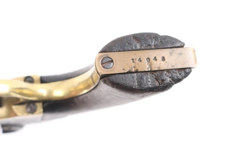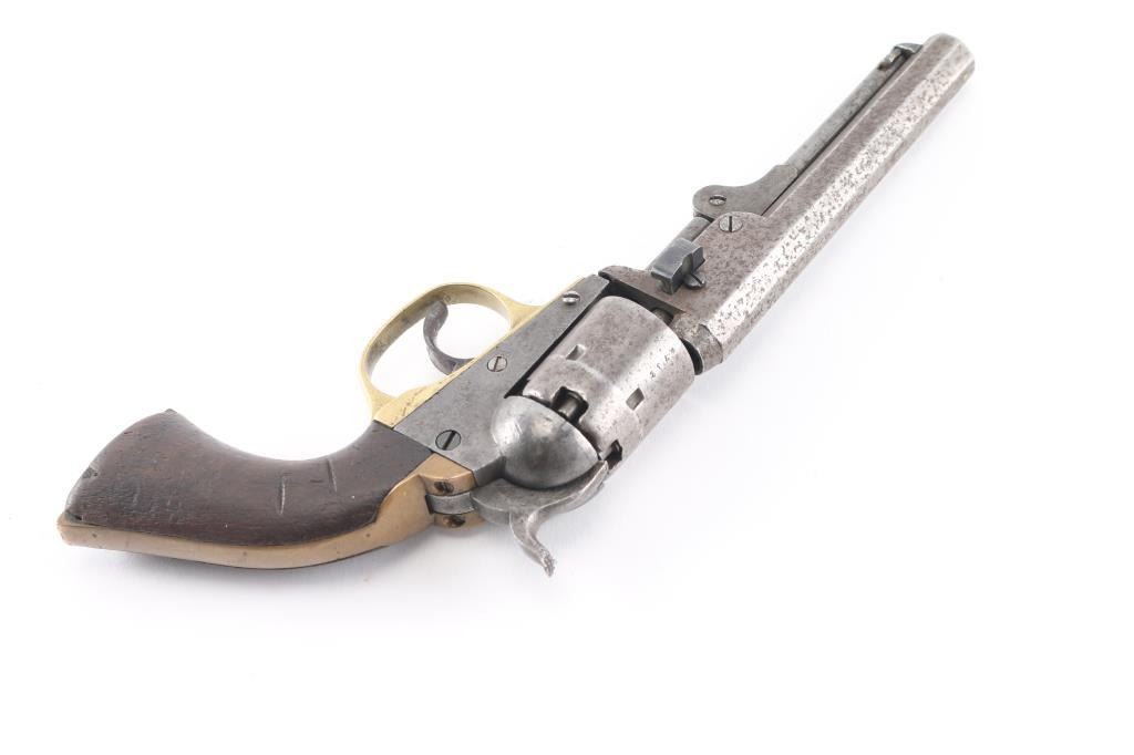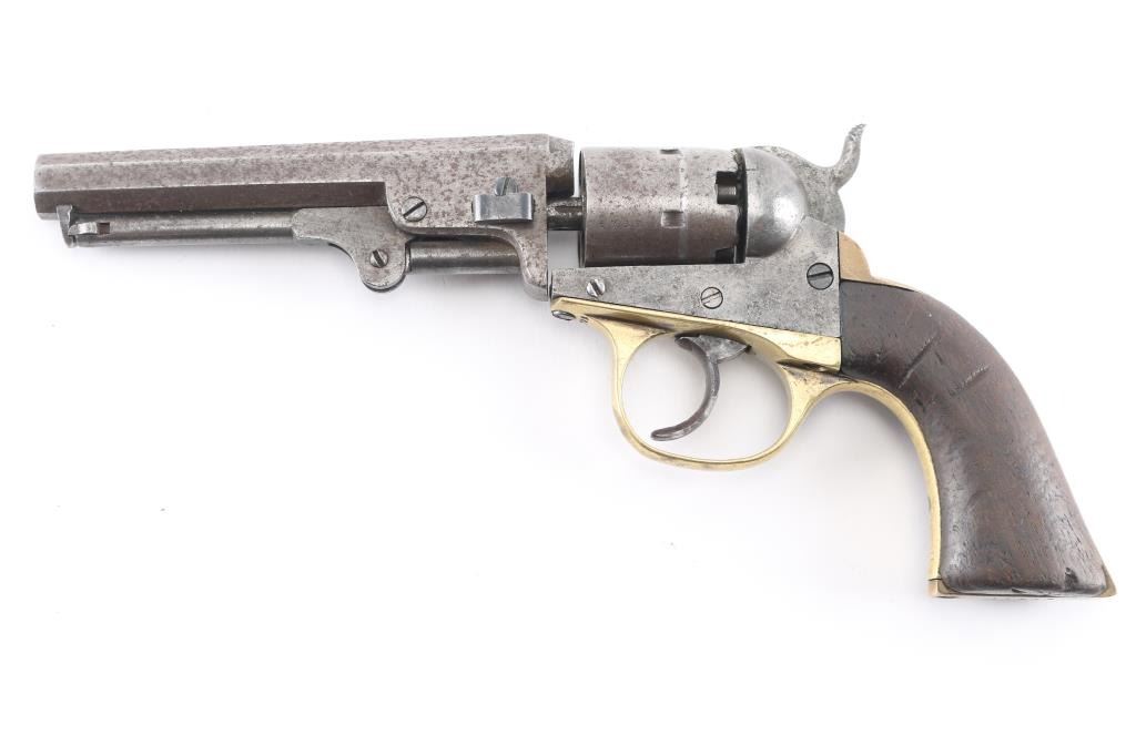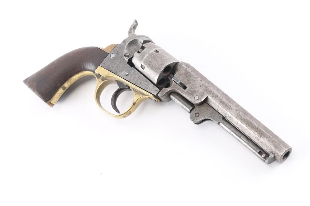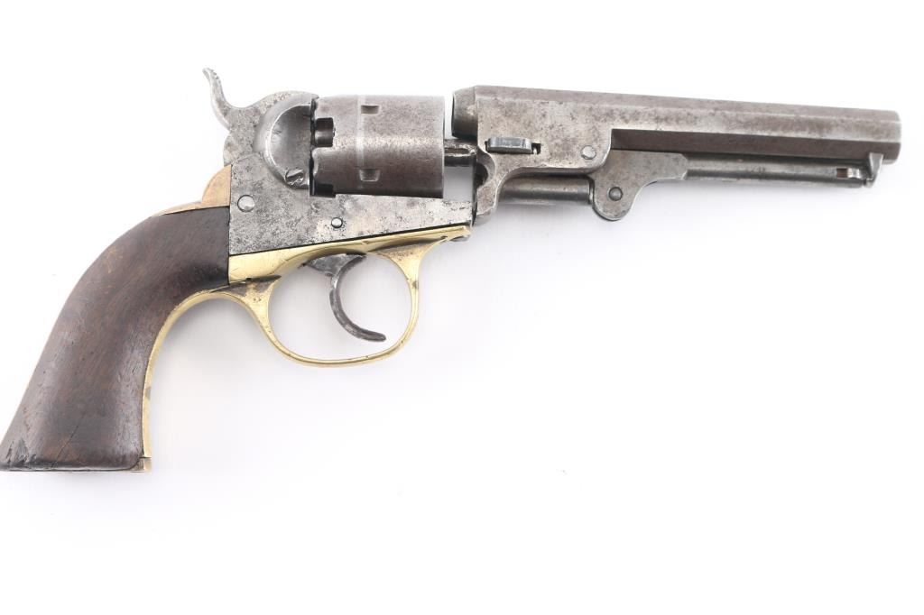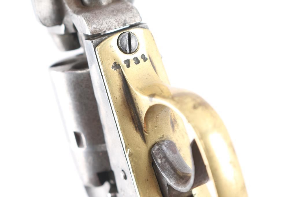Double action black powder cap and ball "pocket" revolver. Produced as a competitor to the Colt revolvers, manufactured sometime between 1860 and 1869, likely circa 1863-64. Features a 5" octagon barrel with loading lever, 5 shot unfluted cylinder, brass grip straps, brass post front sight. (Worn) Bore is poor to fair condition, with pitting throughout, visible rifling remaining. Most metal surfaces are dull gray or patina brown over bare metal. Right side of frame shows vigorous cleaning. The brass trigger guard appears cleaned, with the backstrap showing a mellow darker patina color. The one piece walnut grip is fair condition, solid, with many nicks and dents, shrinkage all around. The barrel wedge is a later replacement, wrong size so the barrel is loose. The trigger will not advance the cylinder, it will operate the hammer in double action only, with improper indexing and poor locking. Single action operation is not correct. Barrel markings show some erosion. Numbered "4732" on triggerguard, & cylinder."14948" on butt. Has a couple of newer replaced screws. Fairly rare, many of these were used in the US Civil War. It appears the hand, and cylinder stop are missing. There are two notches cut in the left grip, appears period done.