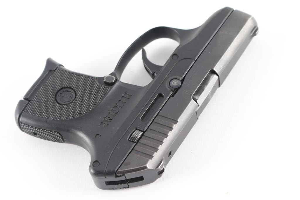 American made double-action-only semi-automatic sub-compact pistol. Features a blued slide, 2.75" barrel, fixed sights machined into the slide, smooth polymer trigger, shrouded hammer, push button magazine release, factory 6 round magazine, and black glass-filled nylon frame with checkered grip panels. Bore is excellent. Pistol is overall excellent with minor edge wear on the slide. Includes Ruger soft case