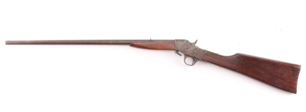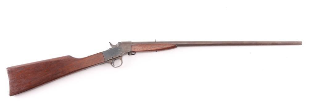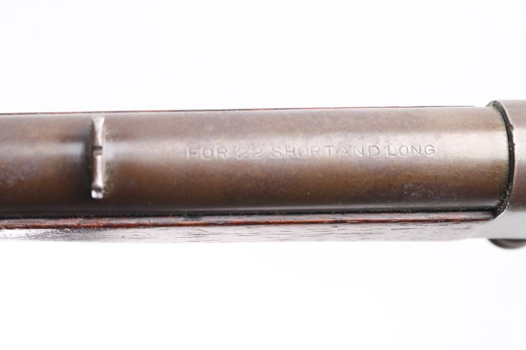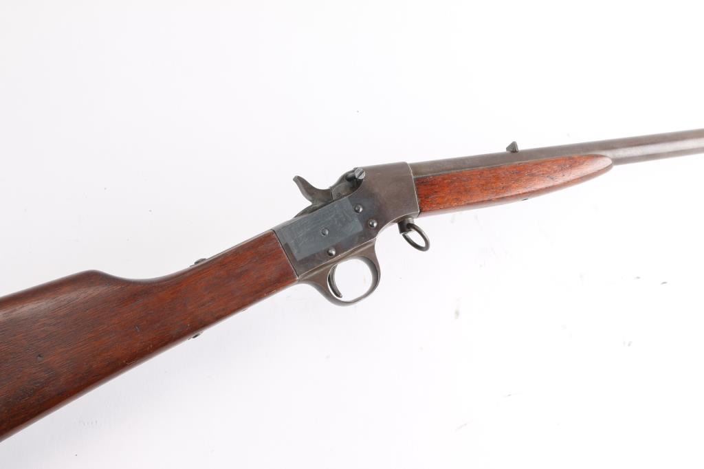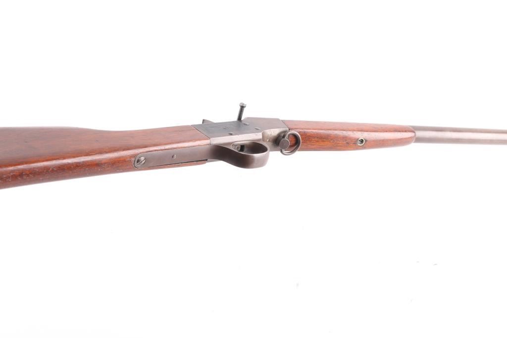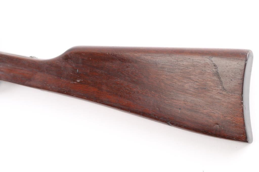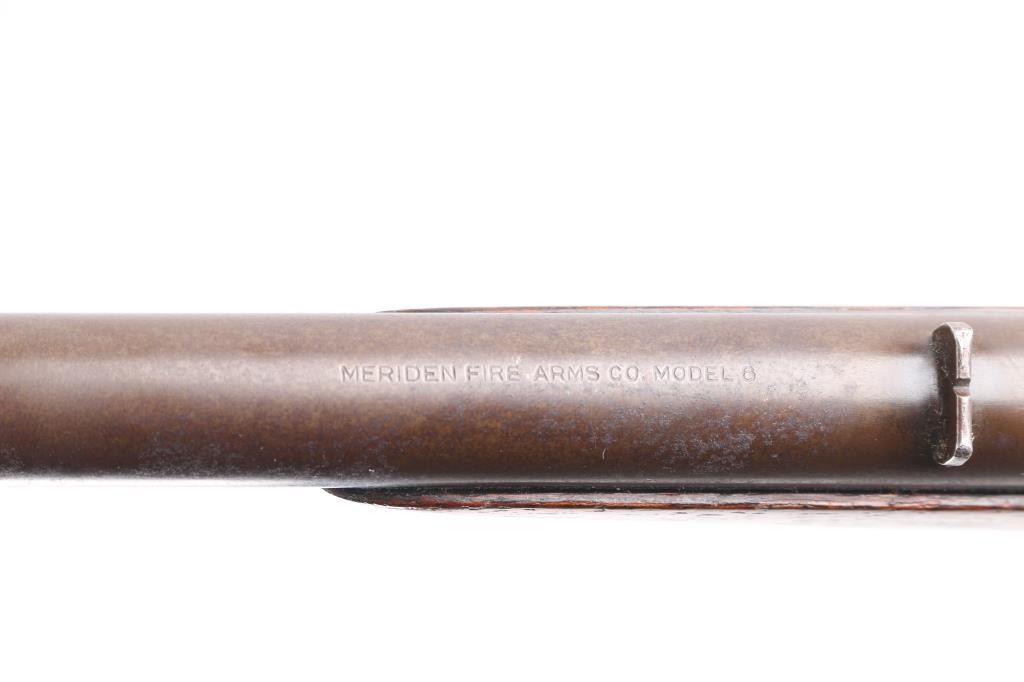Meridian Firearms Co. (1905-1918) "Boys Rifle". Falling block action, 22" round barrel, fixed sights, 36"overall. Take down swivel forward of the triggerguard, Bore is fair, bright with rifling, there is an area of light pitting about midway, finish has turned a brown patina, the right receiver has a square area where it appears that some marking was ground off, wood is very good.