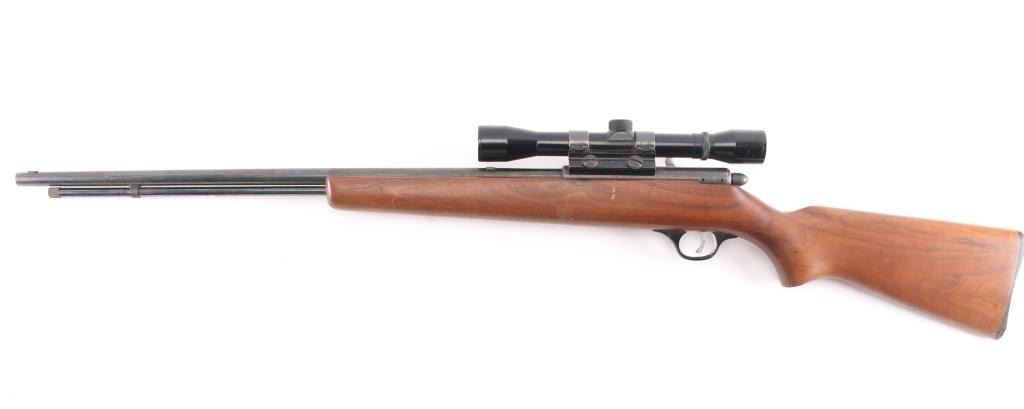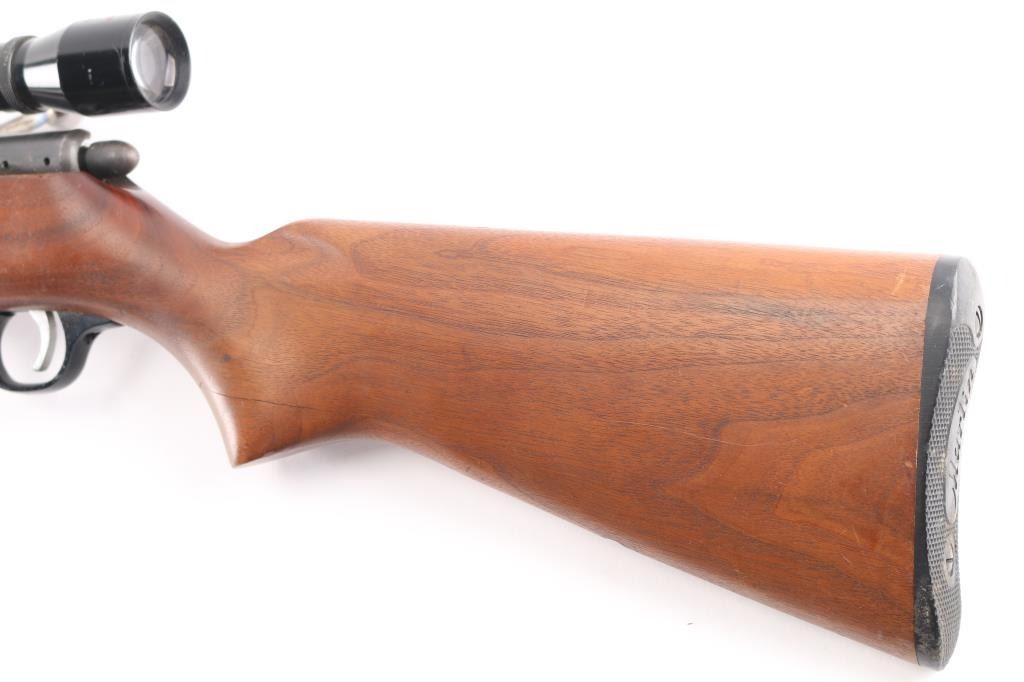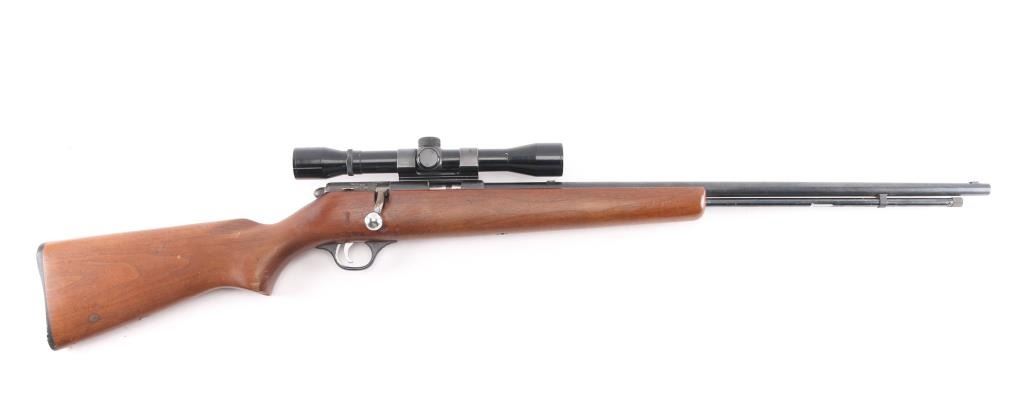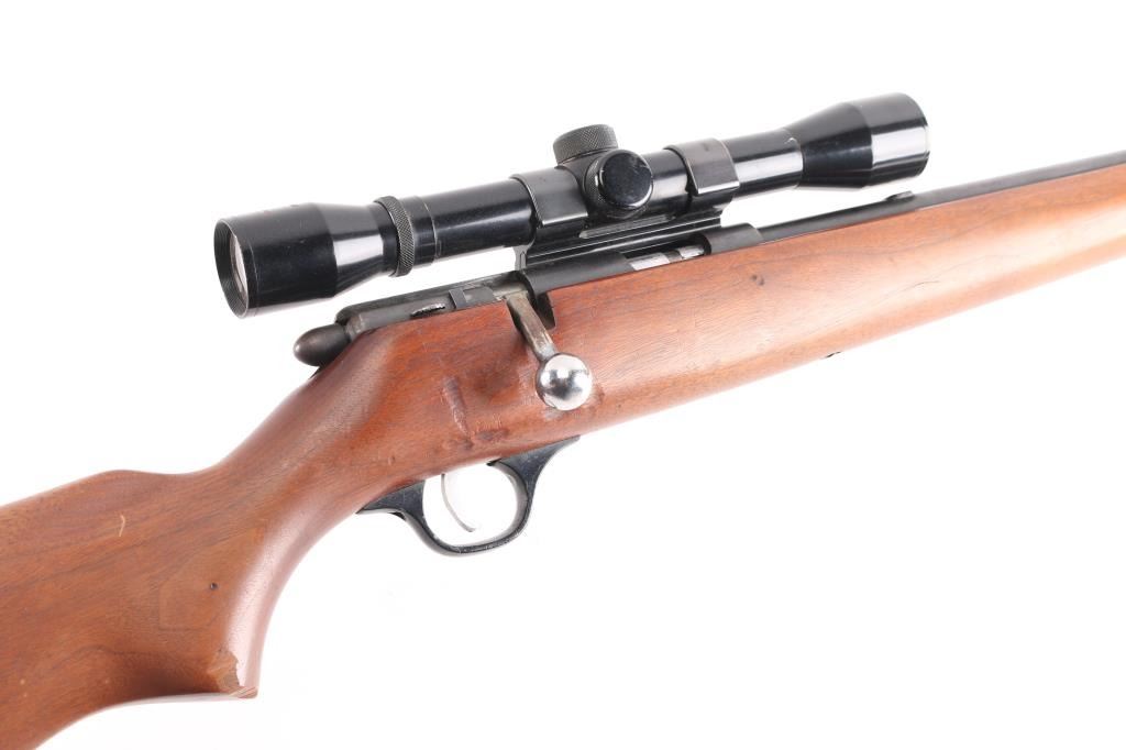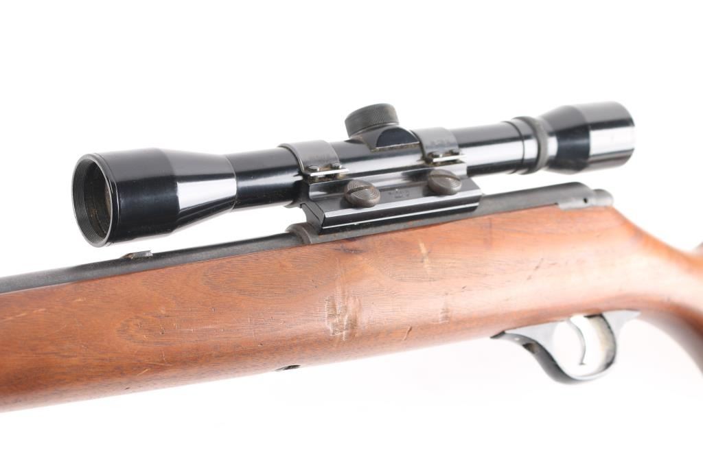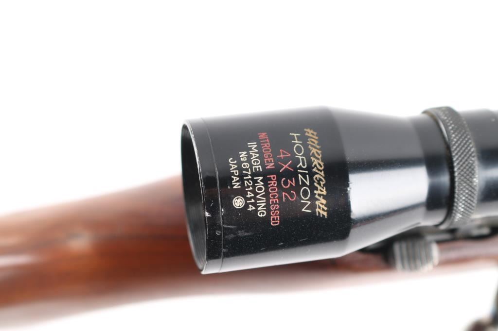 Bolt action tube magazine rimfire rifle. Features blued finish, chromed bolt, smooth walnut stock, sights removed from barrel & replaced with blanks, factory plastic buttplate. Weaver side scope mount with Hurricane Horizon 4x32mm scope, fine crosshairs. Bore is bright, needs cleaning. Overall very good used condition with normal wear and field use. Some rust speckles on barrel and mag tube.