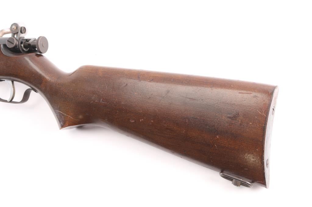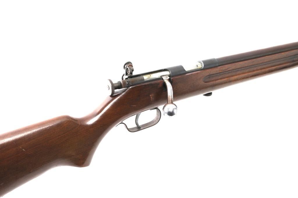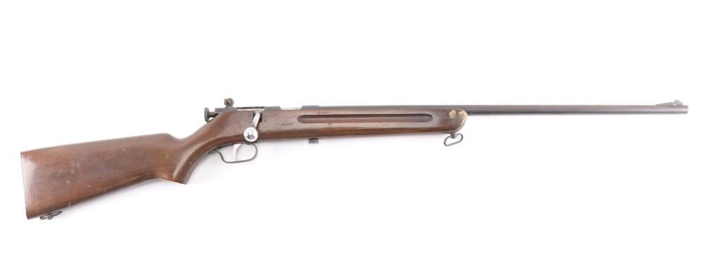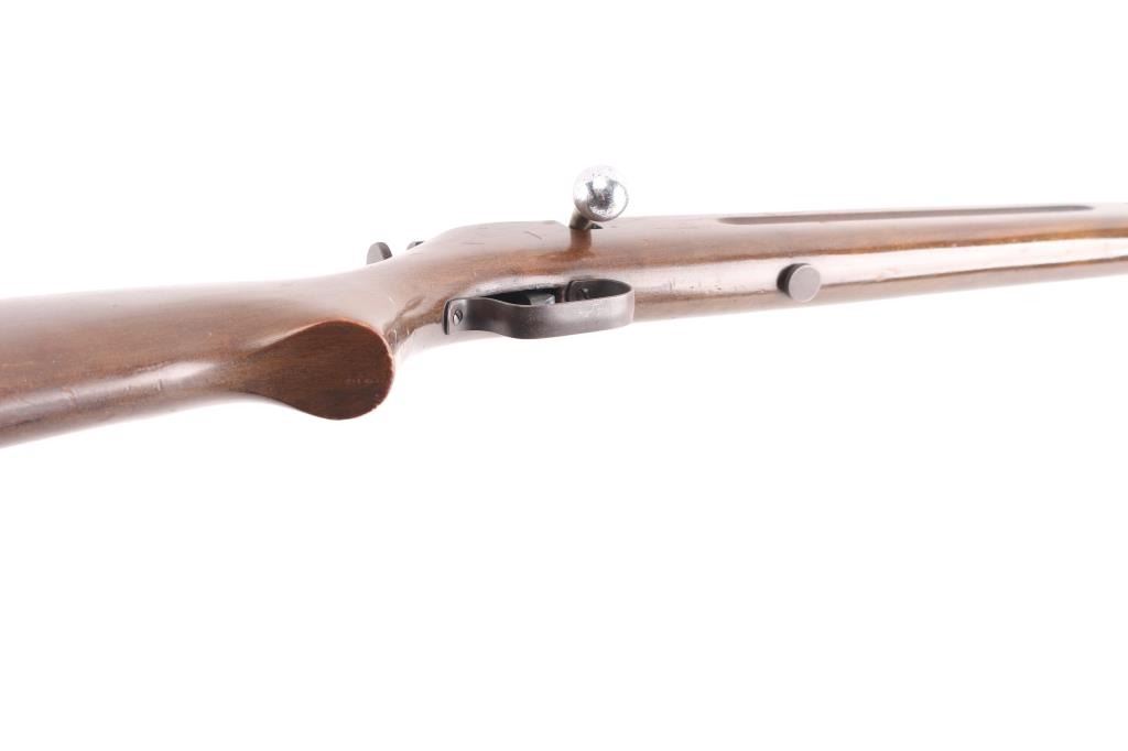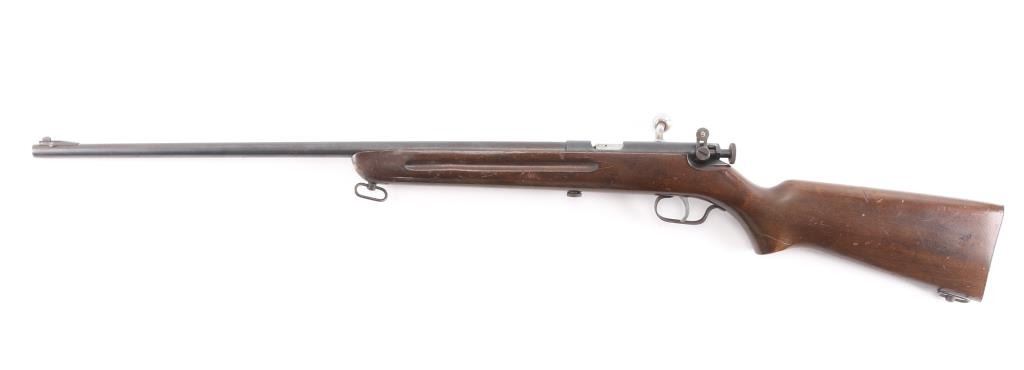 Single shot bolt action rimfire rifle features blued finish, approx 24" barrel, blade front sight, simple receiver mounted peep rear sight, sling swivels. Bolt has automatic safety, to fire the cocking piece must first be withdrawn slightly and rotated slightly to left. Bore is dull, with strong rifling. Finish has drifted towards a brown color on most of barrel, some scattered light storage rust. Wood is good with dings and scratches.