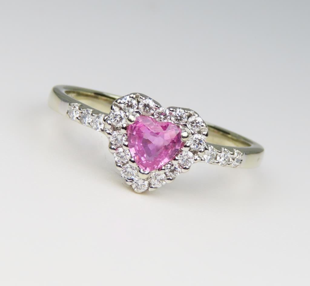 and Diamond Ring featuring a vivid Pink heart shaped Sapphire accented with 20 round cut Diamonds with F-G colors and VS clarity with a combined gem weight of approx. 1.50 carats set in a lovely 14 karat white gold setting, Size 8. Estimates $3,000-$4,000