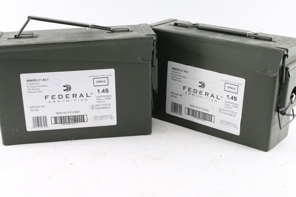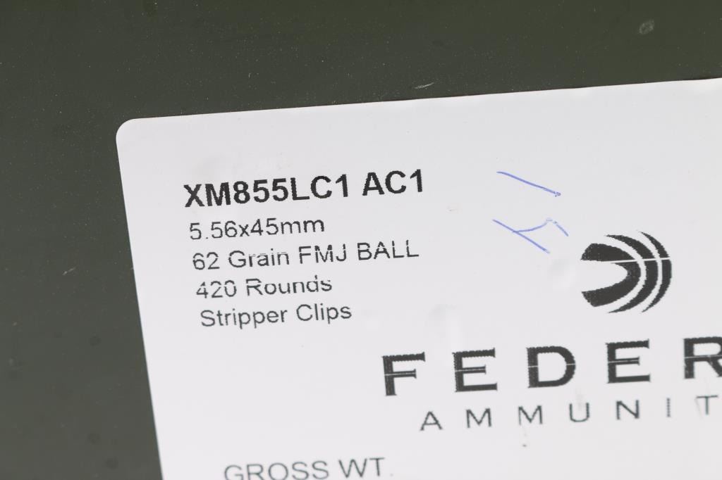 Approx. 840 rounds of 5.56 X 45mm factory new ammunition. Federal, 62 Gr. FMJ XM855LC1, 10 rd stripper clips, 3 clips per box, 28 boxes all in 2 metal ammo cans.