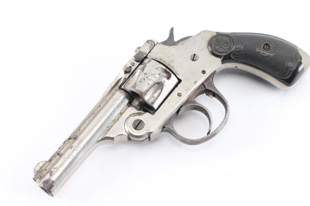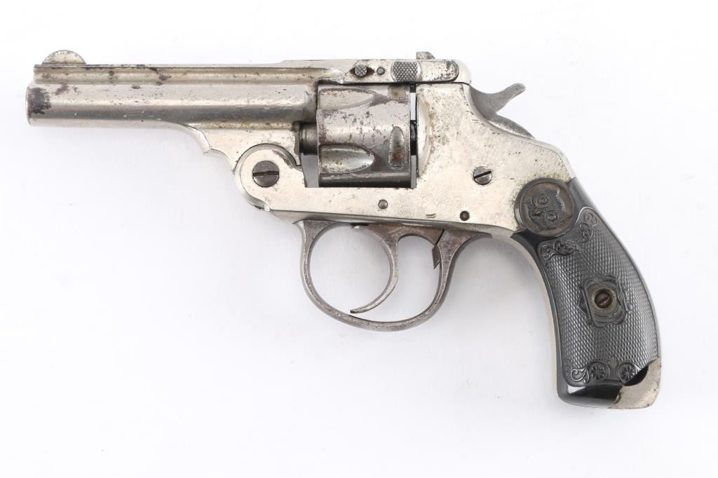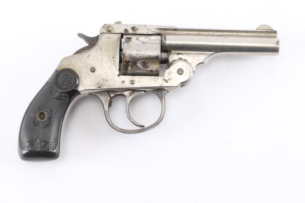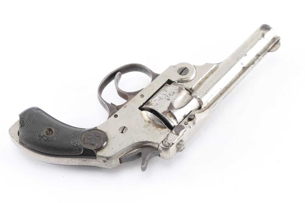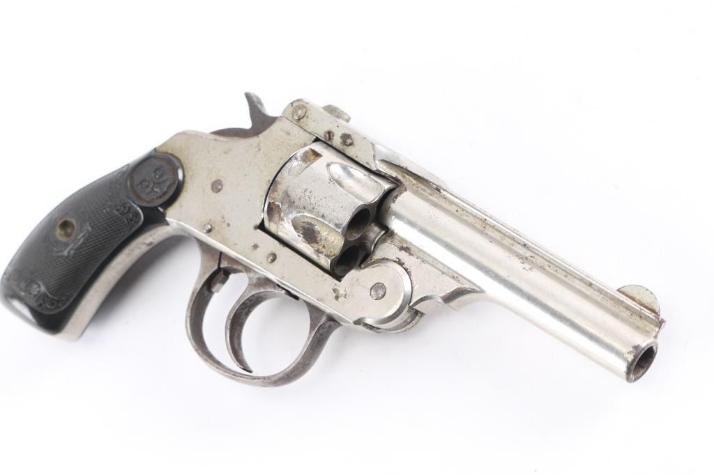 .32 S&W, SN: 30601. First model revolver, as indicated by the left side barrel latch, made in 1894 and 1895. Single and double action. 3” barrel in .32 S&W, cylinder holds 5 rounds. Bore is rifled with scattered pitting, nickel finish is about 80%, finish loss, dark spots of pitting, the left hard rubber grip has a 1/2" chip out of the bottom, the hammer action works fine with cylinder is removed, but does not rotate when installed.