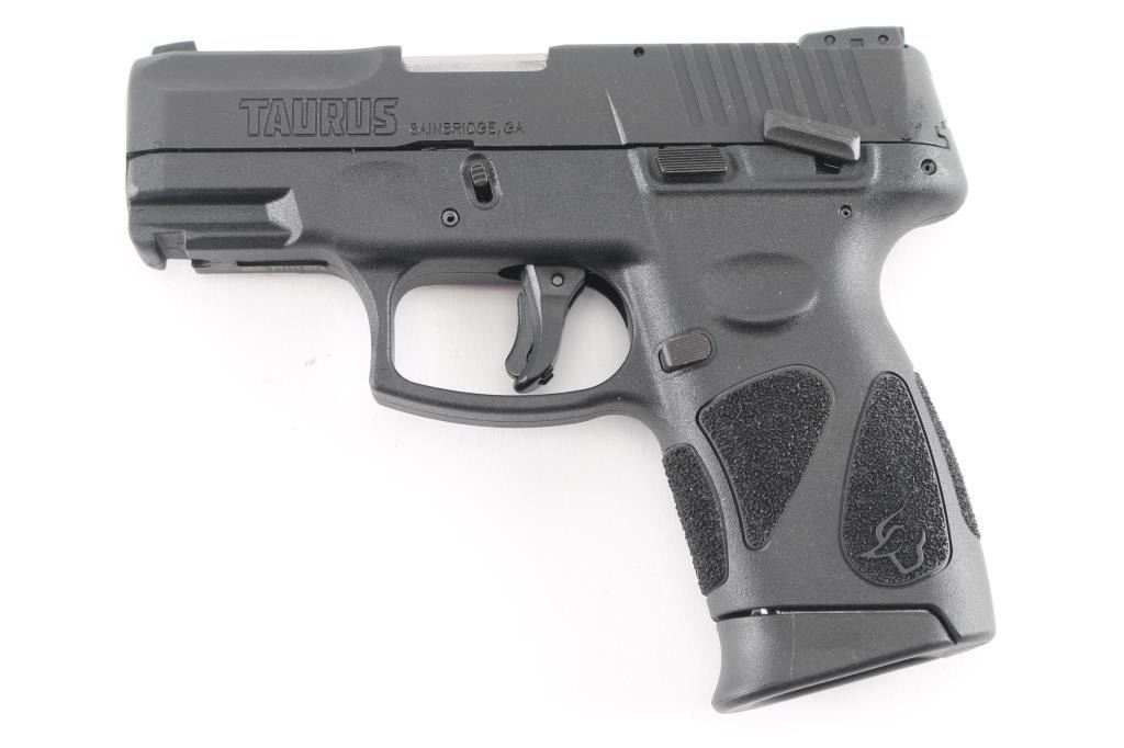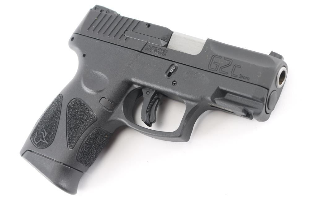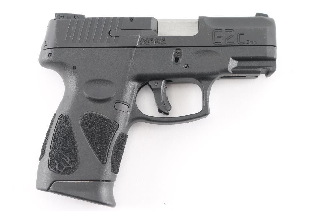 'G2C' Brazilian made compact semi-automatic pistol. 3.2" barrel with 3 white dot sights with adjustable rear, matte black finish, textured polymer grip frame with accessory rail, loaded chamber indicator, frame mounted manual thumb safety and slide release, manual trigger safety, double action only (DAO) with re-strike capability, capable of firing with magazine removed, push button magazine release. Small scratch on right side of slide adjacent ejection port. Bore is excellent. Includes (2) 12-rd magazines with finger extension, manual, lock, factory cardboard box.