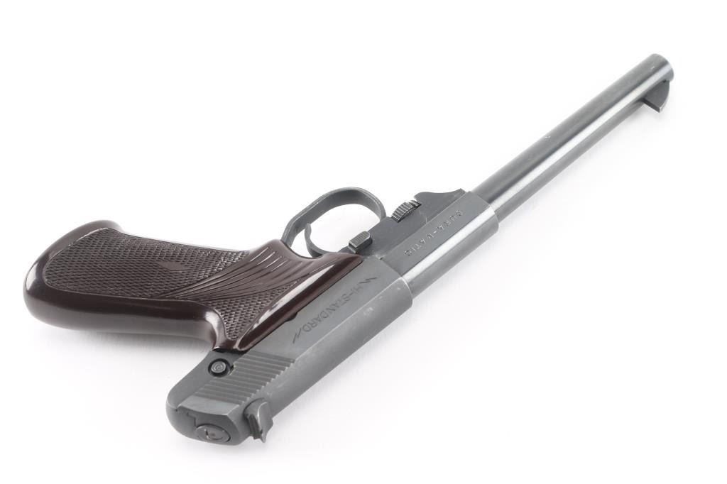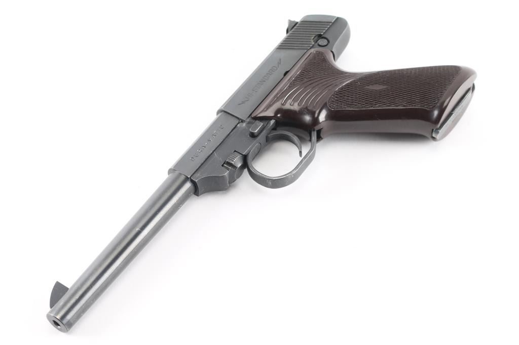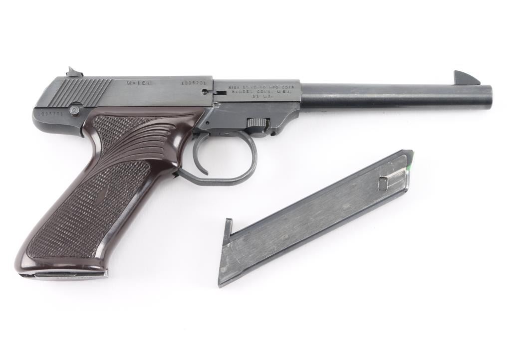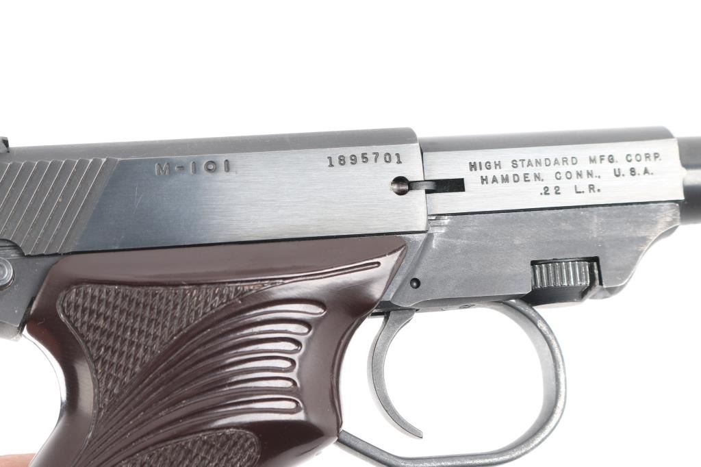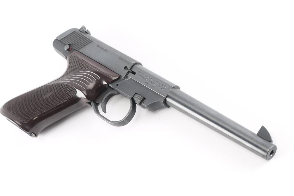 'M-101' Striker-fired semi-automatic rimfire pistol, manufactured circa 1968. Features a matte & polished blued, 6 1/2" round tapered barrel with thumb nut takedown, patridge front sight, dovetailed rear sight with square notch, serrated curved trigger, cocked indicator at the rear, push button safety/slide catch on the frame, push button magazine release on the left side of the frame, steel frame and checkered one-piece wrap-around brown synthetic grip. Bore is in excellent condition and bright. Pistol retains approximately 90% finish showing edge wear and scattered scratches. Grips are fine. Includes two 10 rd magazines.