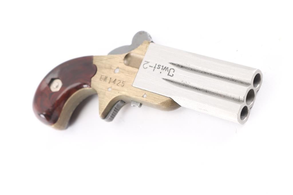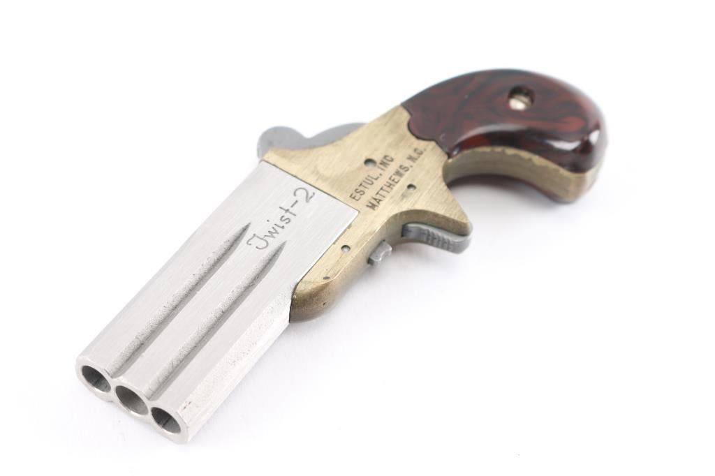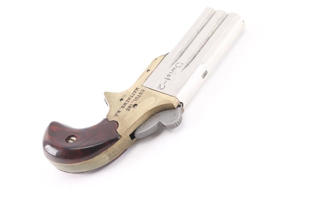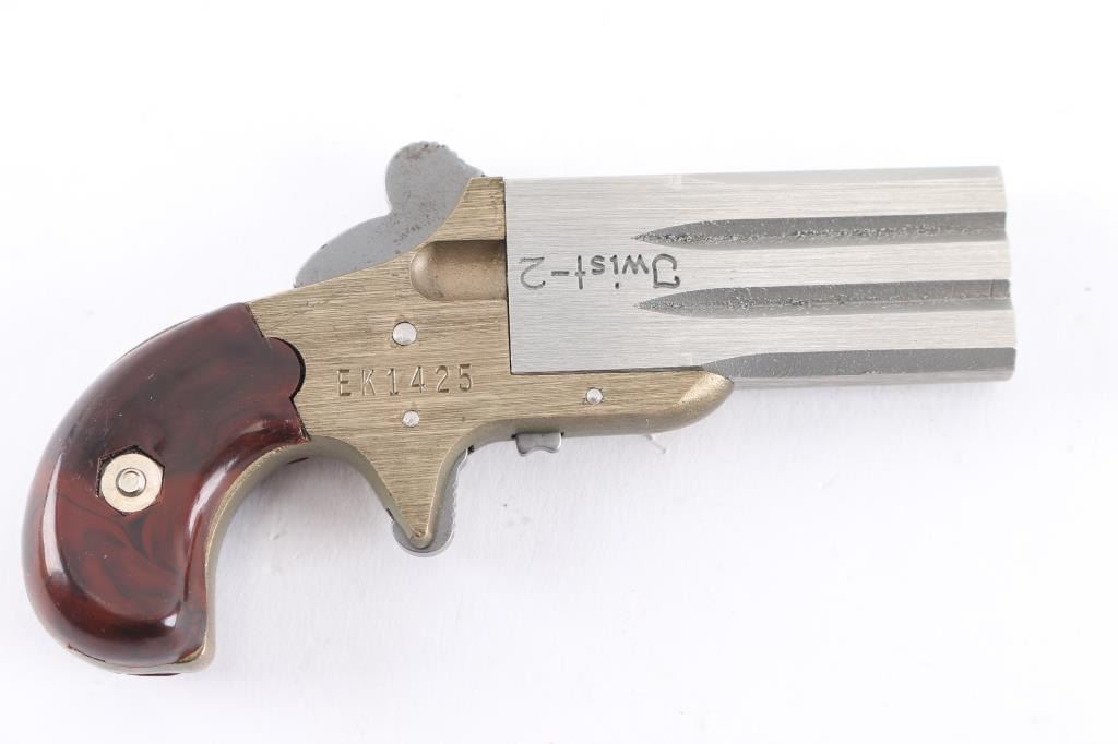 Interesting modern replica rimfire Deringer type pistol, patterned after the Frank Wesson "Vest Pocket". Features brass frame with spur trigger & bird's head grip, 2" double barrel twists to change barrels, no sights, smooth brown synthetic grip panels. Barrels, trigger, hammer are bare metal, possibly stainless. Overall unused condition, few handling marks to the brushed finish. Grips are a fair fit to frame, show very good condition.