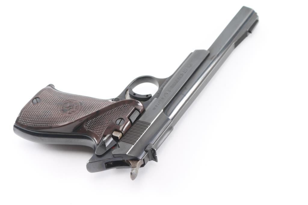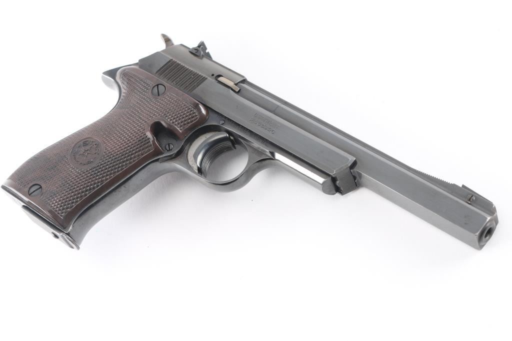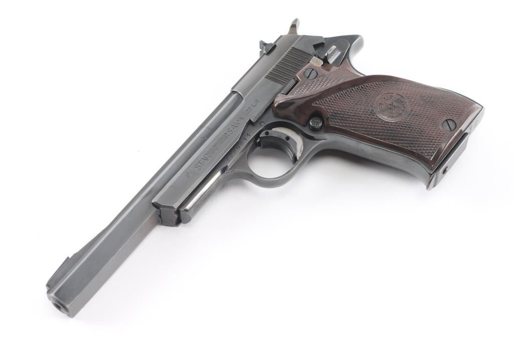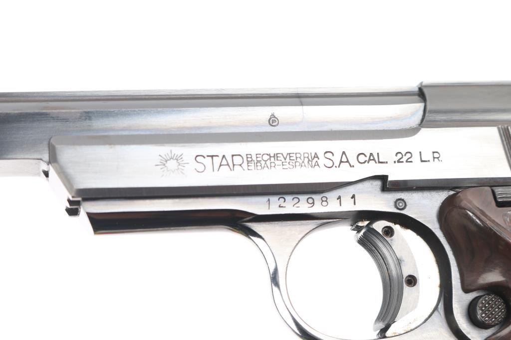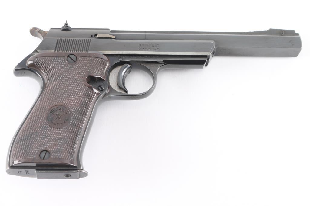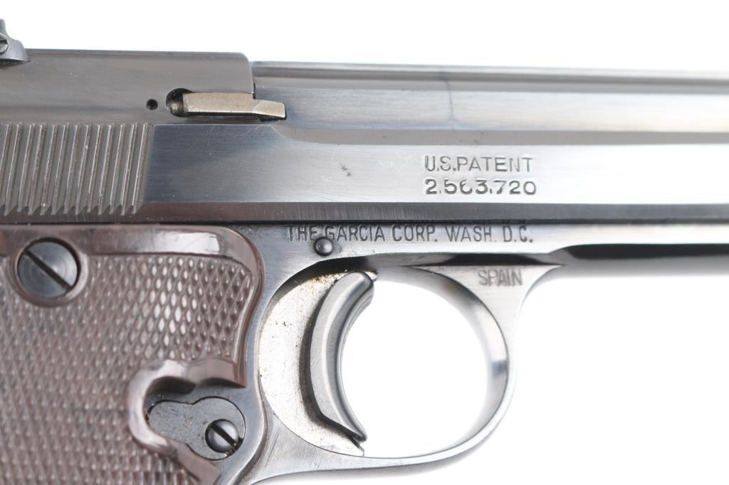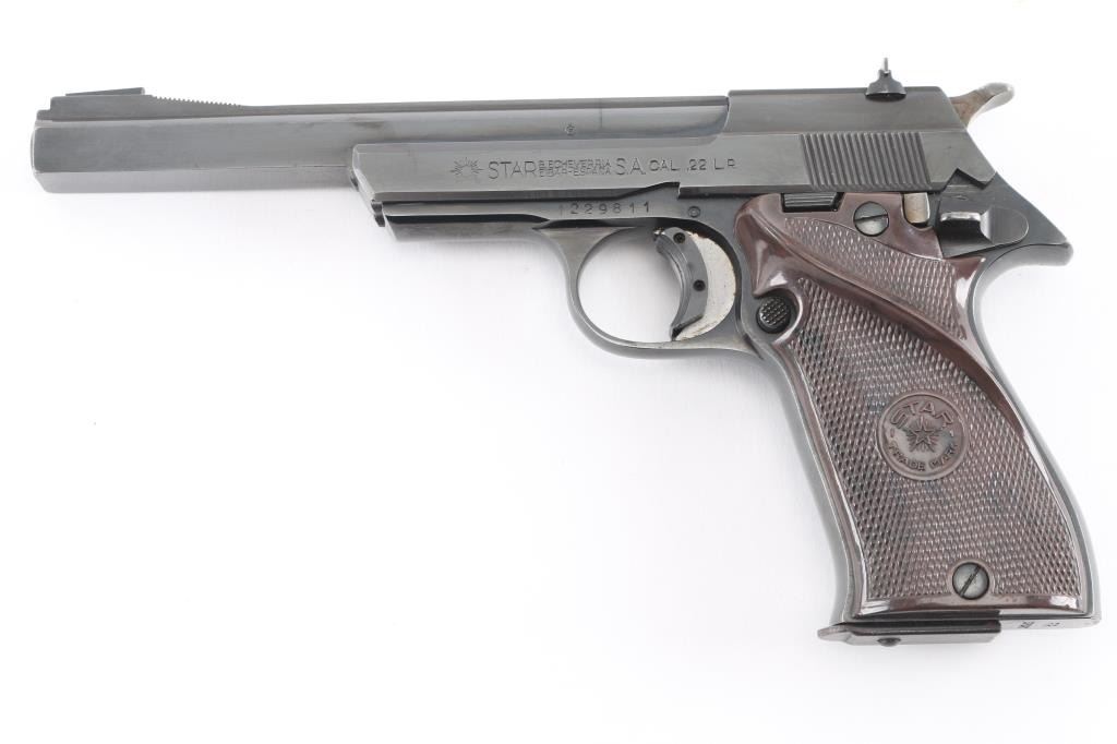 Spanish semiautomatic rimfire target pistol imported by Garcia, with import markings on frame above trigger. Date code 1972. Features blued finish, 6" squared-off slab sided heavy barrel, checkered brown plastic thumb rest grips with Star logo, wide trigger shoe, push button mag release, pinned front sight, dovetailed rear sight, single action, knurled hammer spur, thumb safety. Bore is very good bright condition. Retains 95-98% finish with signs of normal wear and use. Grips are near excellent. Includes one magazine.