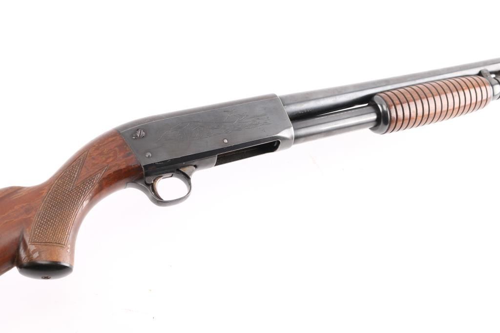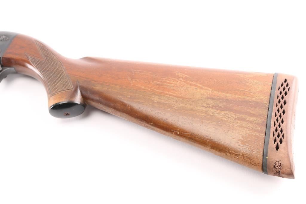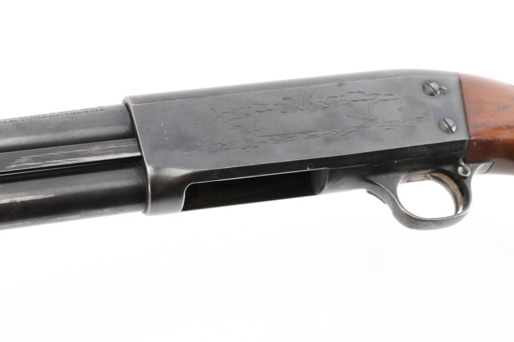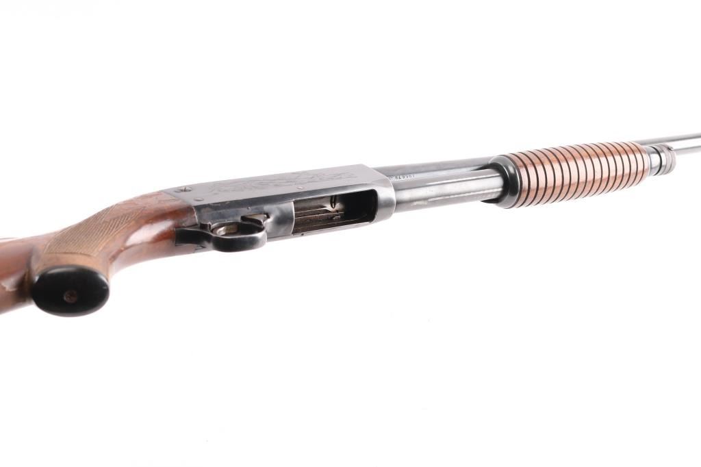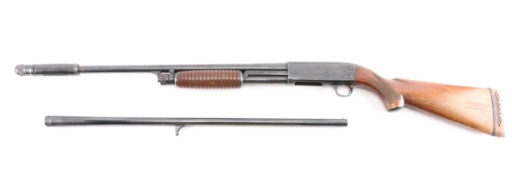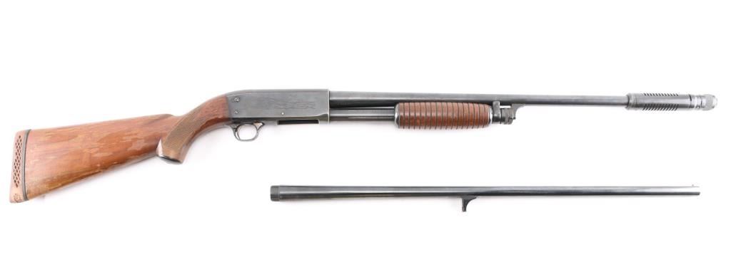 Vintage bottom ejecting pump action repeating shotgun chambered for 2 3/4" shells, manufactured in Ithaca, NY circa 1952. Features approx 20" plain barrel with added Cutts ventilated adjustable choke (combined barrel length is 26"), bead front sight, roll stamped game bird and dog scenes on the receiver, push button safety, single action bar, grooved walnut pump handle & pistol grip shoulder stock with checkering at wrist, ventilated rubber recoil pad. Bore is good condition, a bit dim, might improve with cleaning. Retains 90% blued finish showing edge losses & scratches, rubbing wear on moving parts, a few small spots of patina on barrel. Wood is good or better with finish losses, scratches & dents. Barrel numbered "495678-2". Includes a spare barrel, 28" plain, brass bead, 2-34" shells, Mod choke, very good bore, very good bluing. The spare barrel does not appear to fit this gun properly, needs gunsmith fitting.