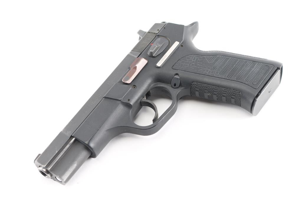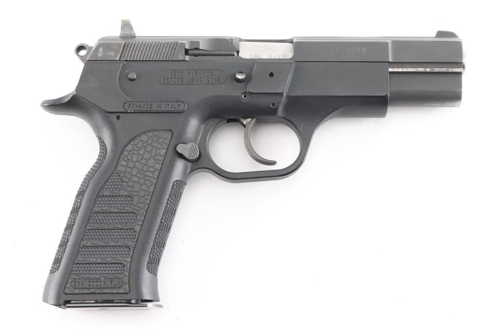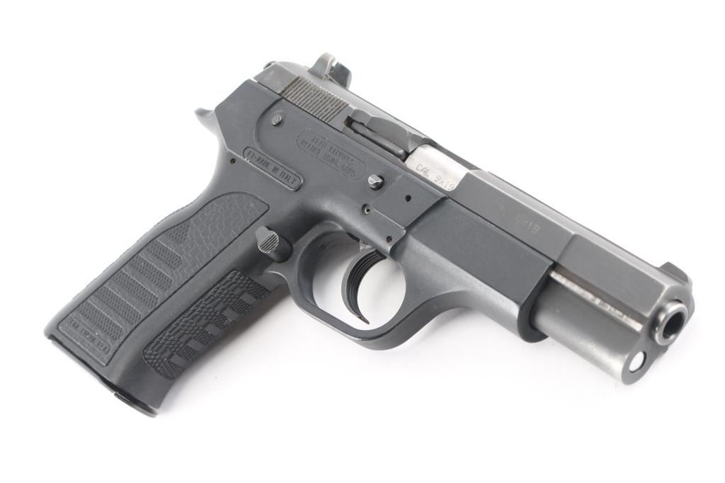 Italian made full size semiautomatic pistol. Previous owner states the firing pin is defective. Features 4.25" barrel, matte blued slide, black polymer frame, double action, frame mounted safety, 3 dot sights, push button mag catch (installed for left handed use). Bore is very good. Retains 80% finish on steel parts, with thinning and fading, edge losses. Polymer is very good. Includes one magazine.