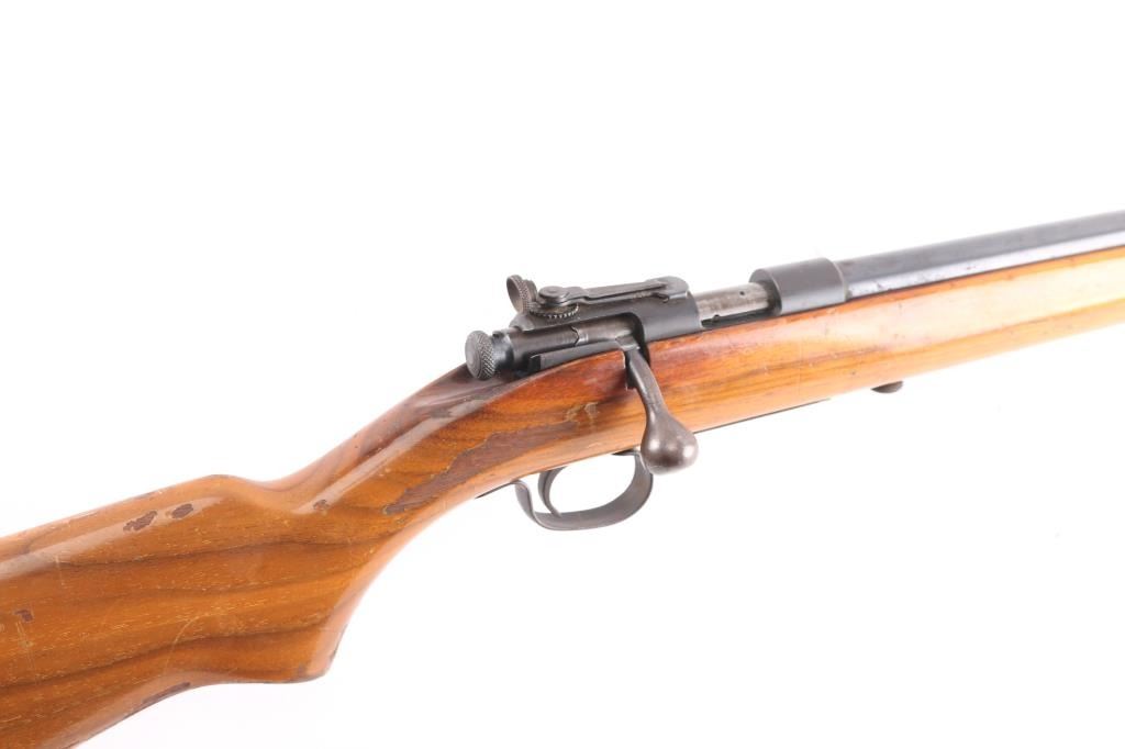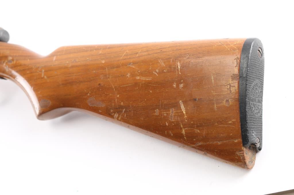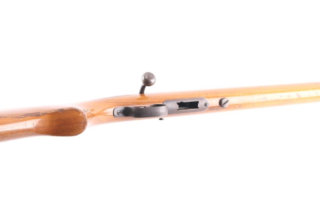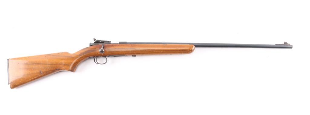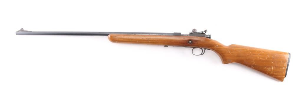 American made bolt action repeating rifle, manufactured circa 1935-1963. Features a blued finish, 25" barrel, dovetailed blade front sight with bead top, adjustable rear peep sight mounted on rear of receiver top, metal trigger guard, knurled cocking piece, manual safety (twist cocking piece to apply), smooth walnut pistol grip shoulder stock, factory composition buttplate, accepts 5 rd magazine, mag release button in left side of stock. Bore is very good condition. Retains 95% finish with edge losses & handling marks, some minor spots of surface rust. Stock has a 1" chip out of the toe, butt plate with cracks around the damage,