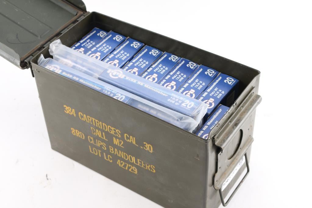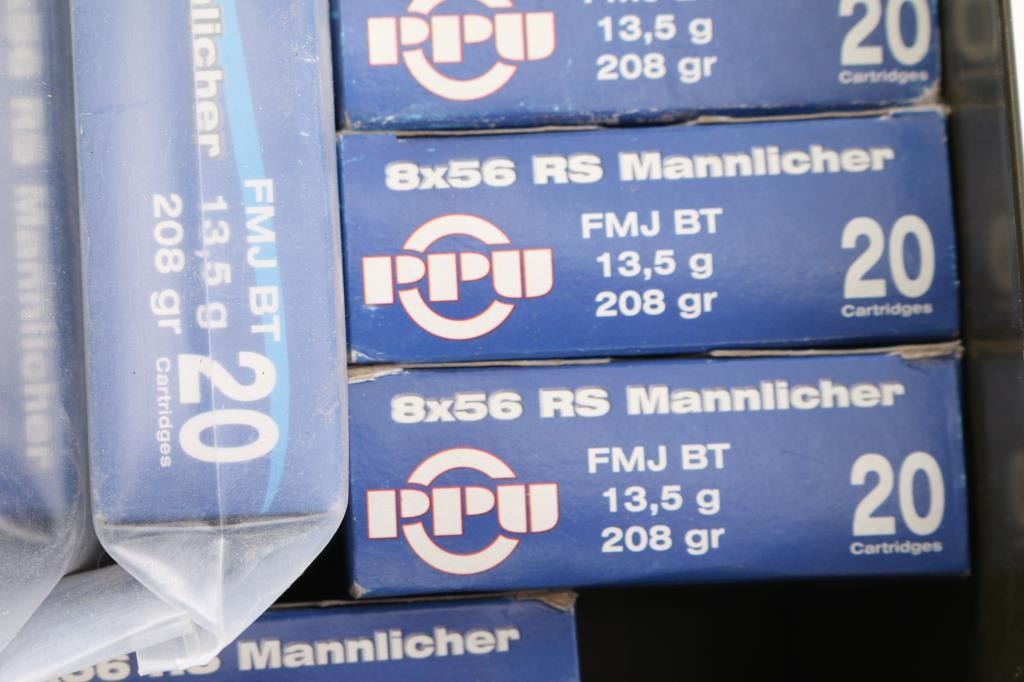 Approx. 300 rounds of 8 X 56mm RS Mannlicher factory new ammunition. 208 Gr. FMJ BT, made by PPU. 20 rd boxes all in metal ammo can. Approx. LBS.