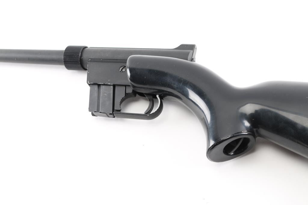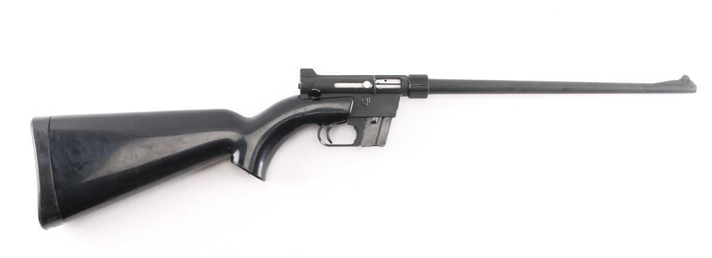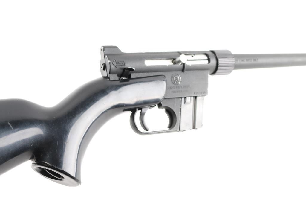 Semiautomatic rifle chambered for 22LR, close copy of the original Armalite rifle as designed by Eugene Stoner. Features black finish, polymer buttstock/storage, blade/ramped front sight, rear peep sight, 16" barrel, manual safety. Barrel and action can be stored inside buttstock for storage or travel. and will float. Bore is excellent/bright. Black finish on barrel has a few scuffs, minor scratches. The receiver looks good with some edge wear/scratches, and the poly stock is good but used. One ten round magazine.