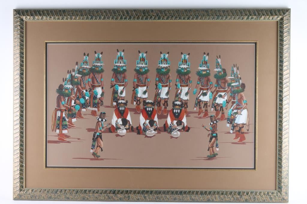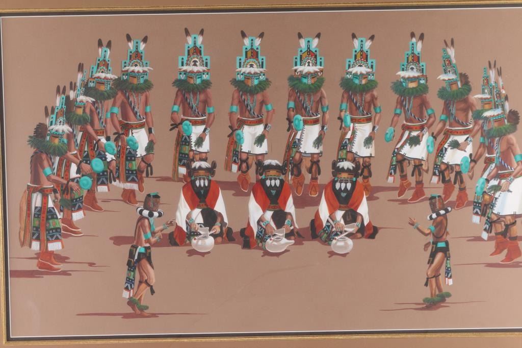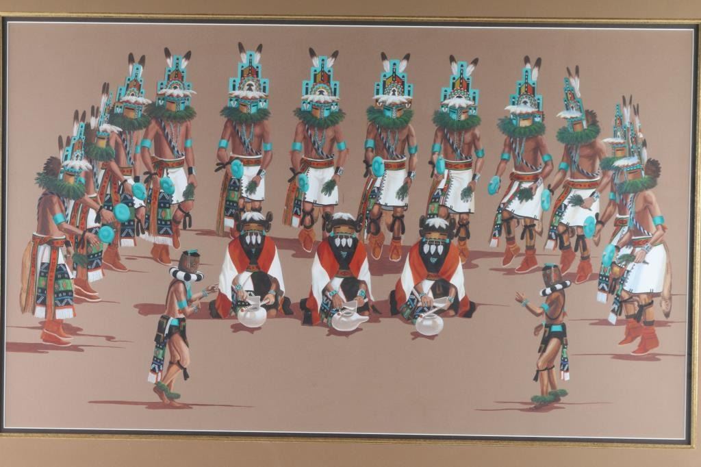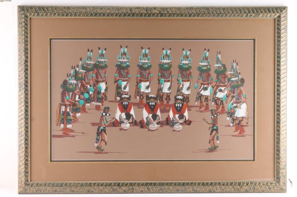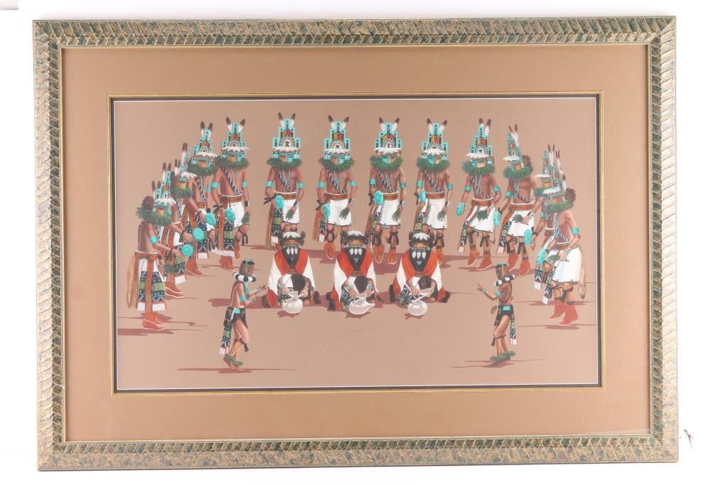 by Raymond Naha, depicting 17 Kachinas in a Ceremony. Hand-signed lower right, double-matted, measures 31x18 1/2.