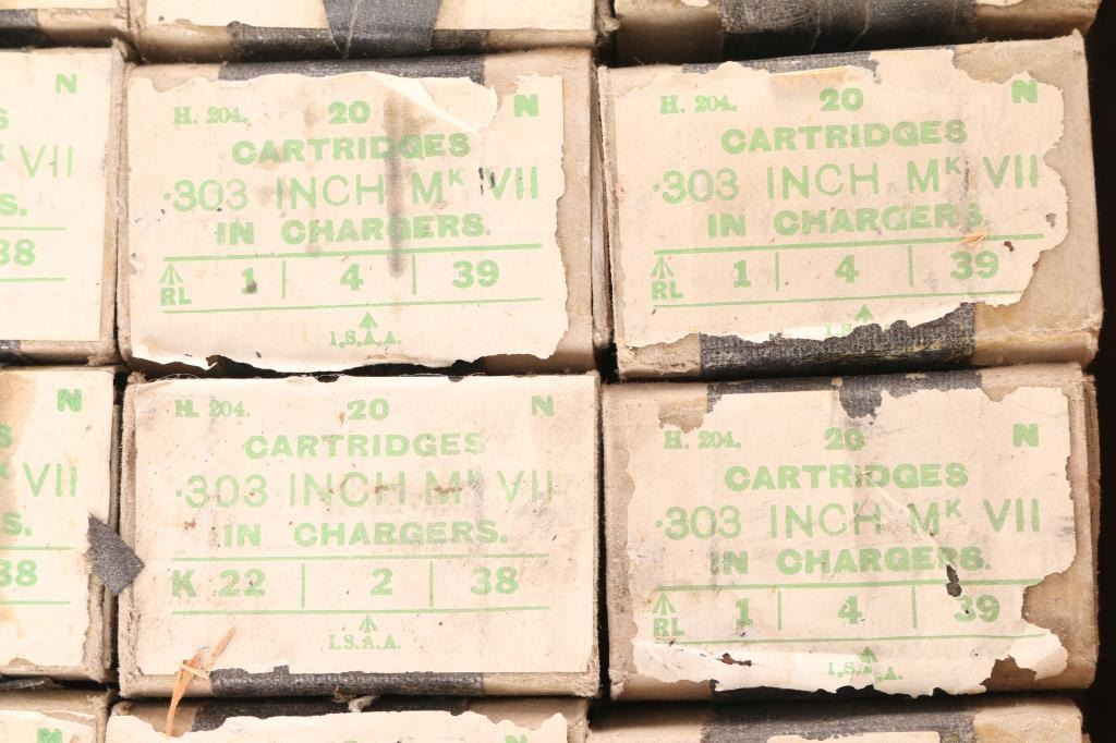Approx. 620 rounds of .303 British factory new ammunition. Ball MK VII, 20 rd factory boxes, 5 rds per clip. All in wooden crate.
