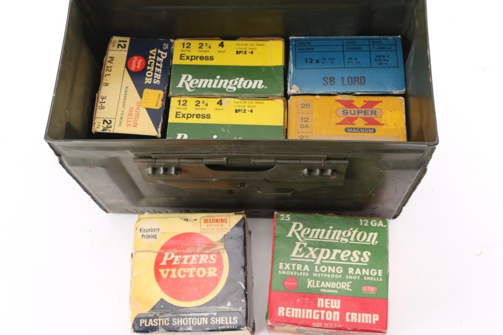 Approx. 175 rounds of 12 Gauge shot shells, various brands and shot, in factory boxes. All in metal ammo can.