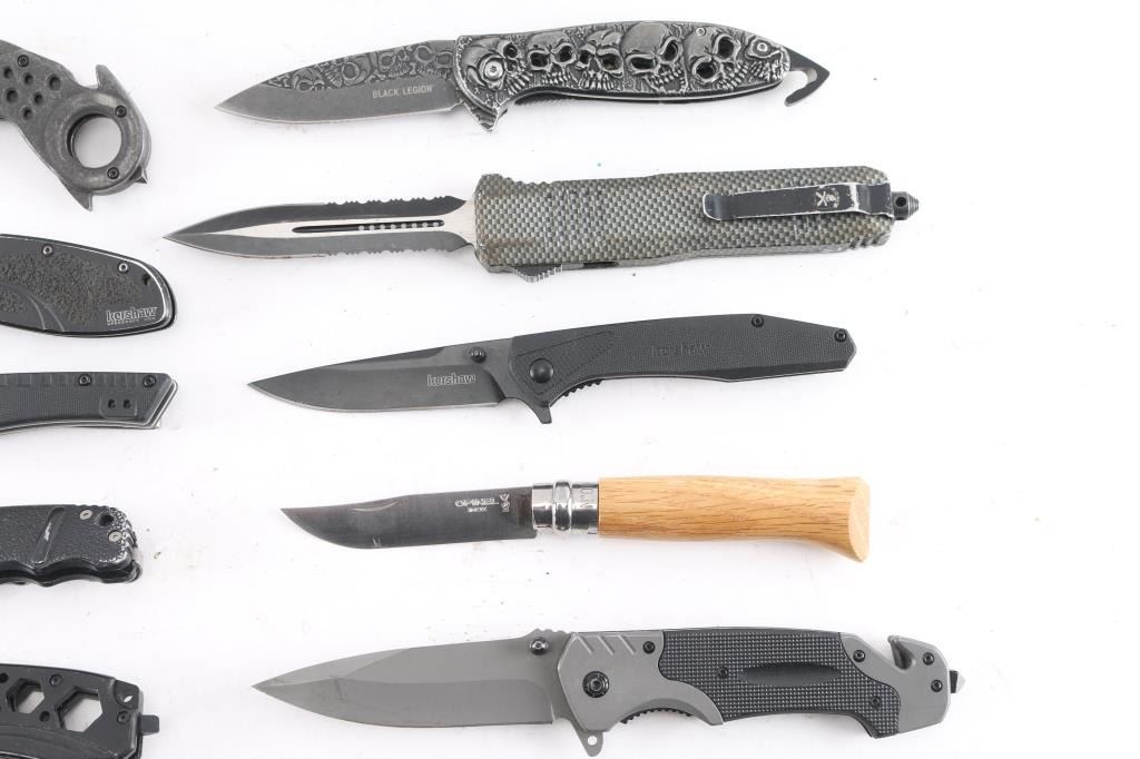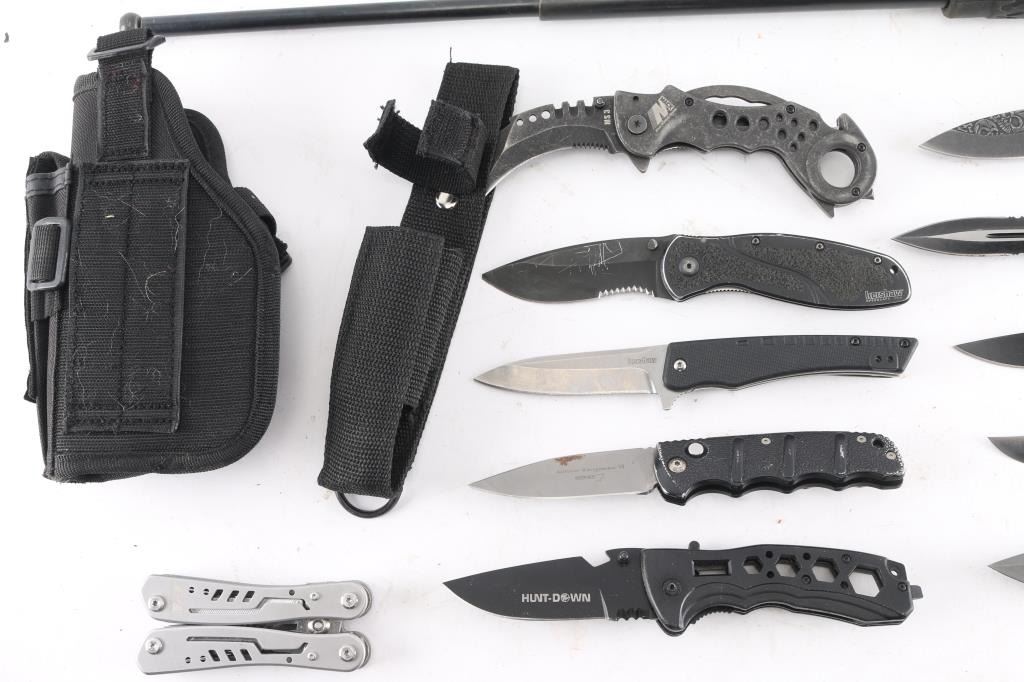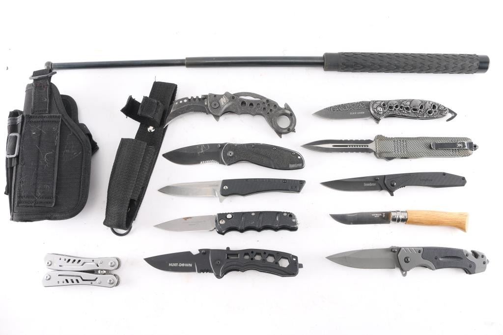 12 total. Includes: 3 Kershaw, black handles w/ 3 1/4" blades & assisted opening; 1 Boker Automat Kalashnikov 74 black handle w/3 1/4" blade & push button assisted opening, one Black Phantom automatic w/ 4" partially serrated blade w/ glass breaker heel & many others. Also included is a 16" retractable steel baton w/rubber grip, nylon sheath; a stainless steel wire cutter leatherman type tool & black nylon gun holster.