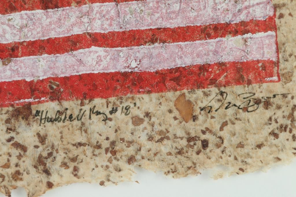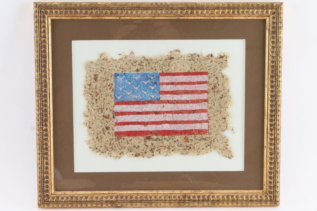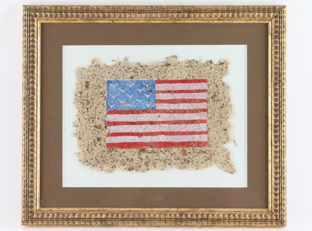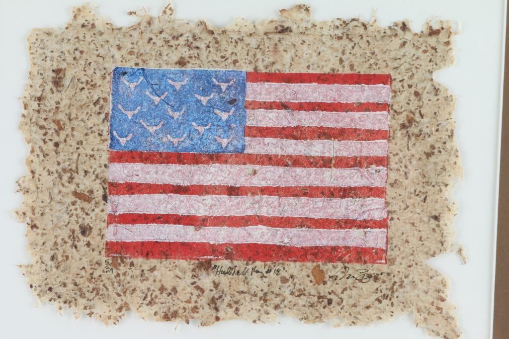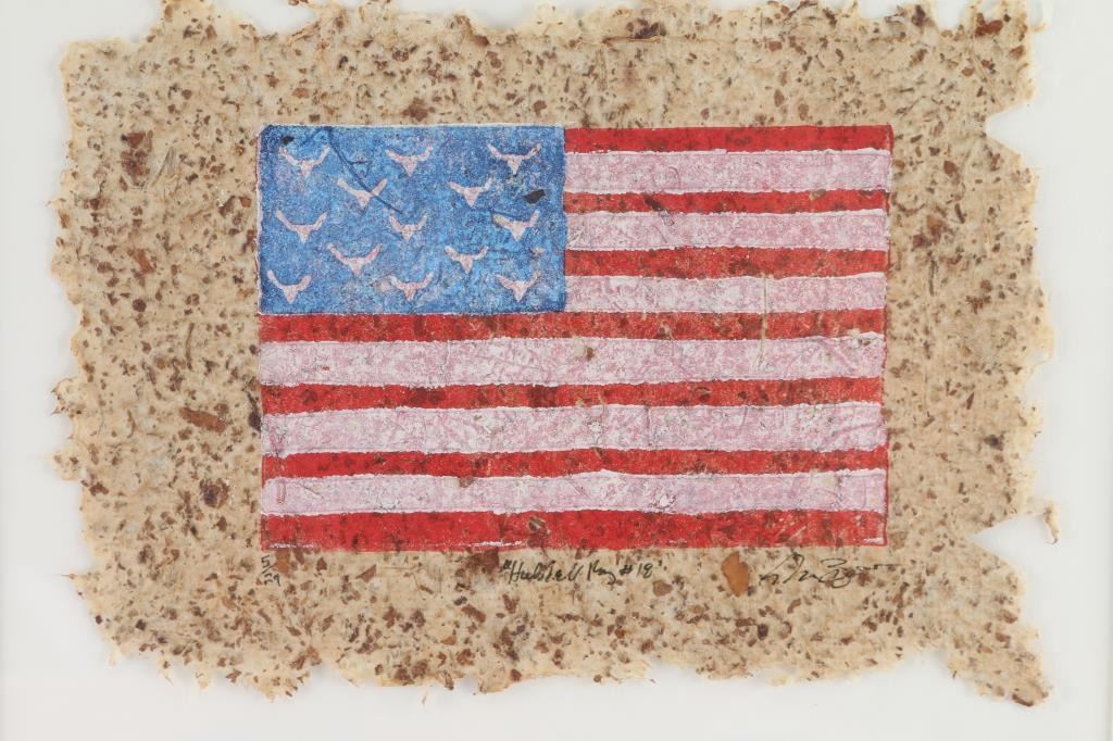 on paper, limited edition, number 18, titled, "Hubbell Rug" limited edition. Signed by artist. Depicts an American flag, with buffalo skulls instead of stars.