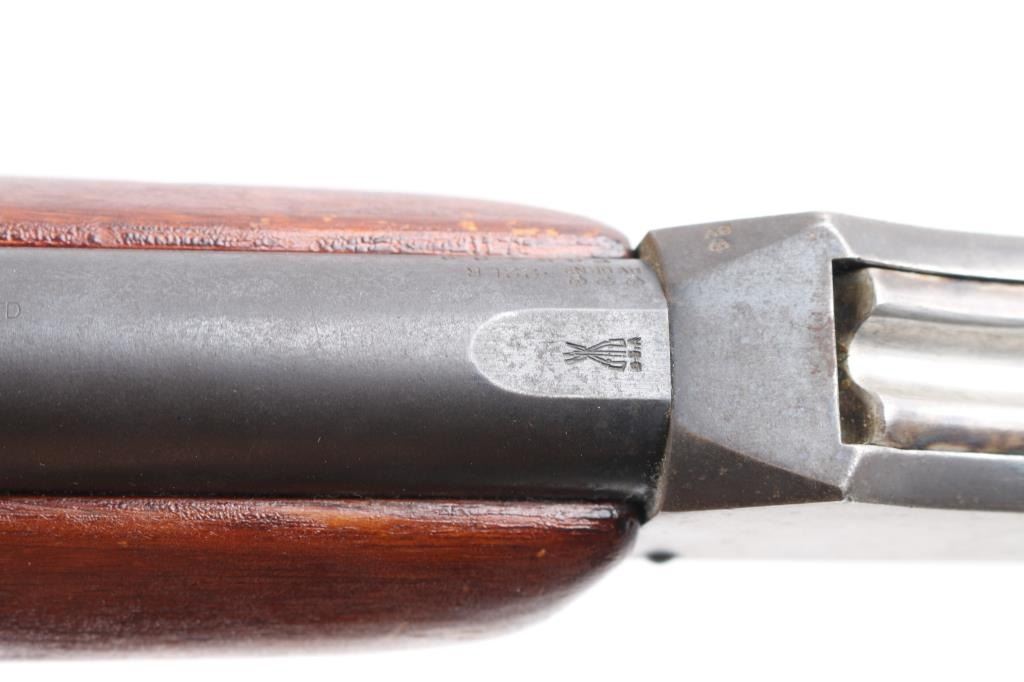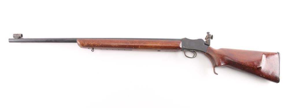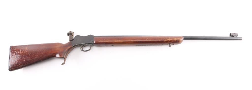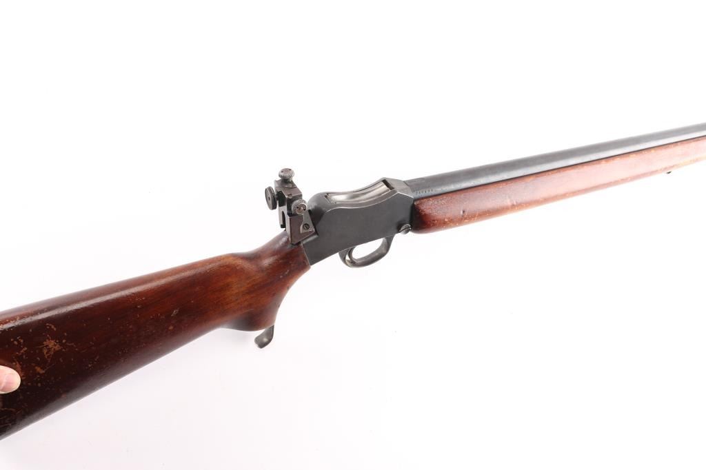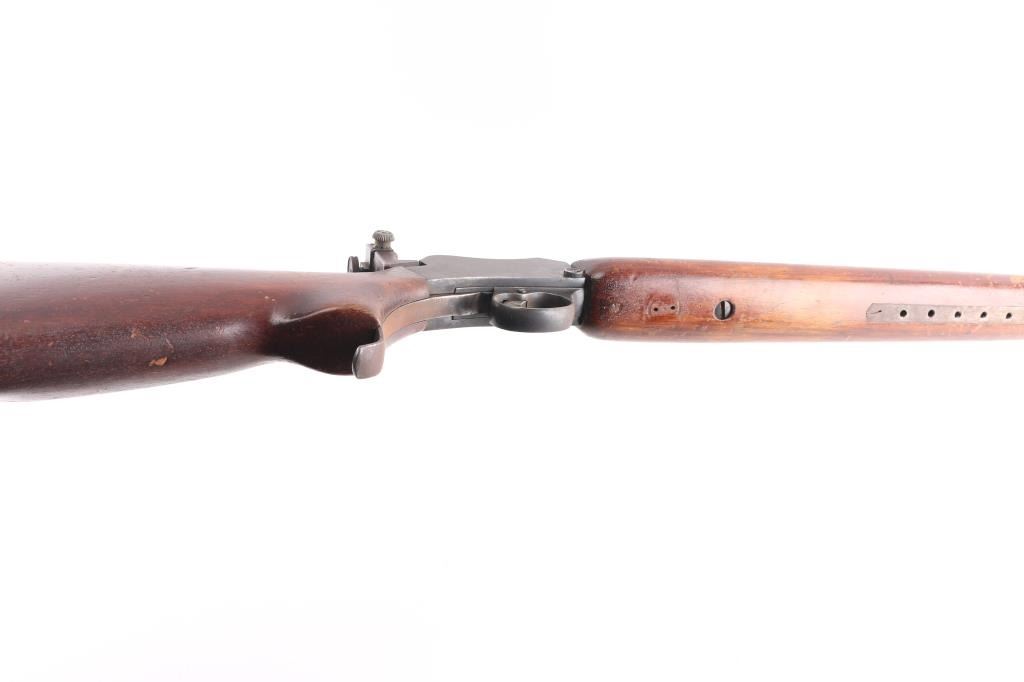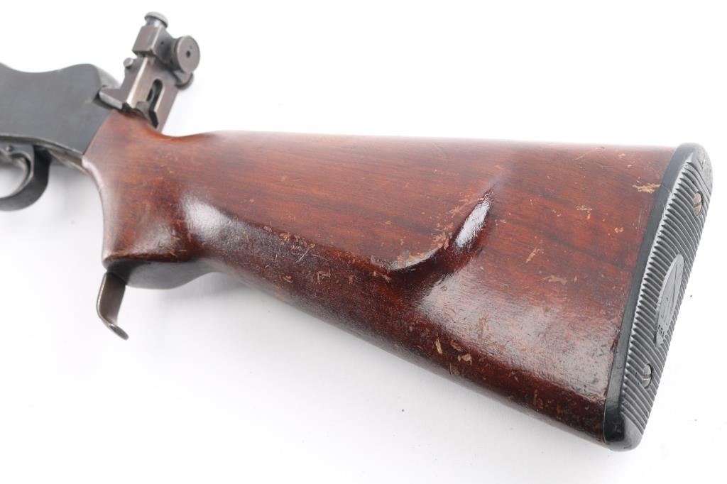 This is a BSA Target, single-shot, falling block, 22LR. Made by Birmingham Small Arms Co. in England. This is the model 7 with the 29” barrel. This rifle has Parker-Hale mounted rear peep sight, and a Parker Hale dovetailed globe target front sight. Estimated to be manufactured between 1909 and 1940 probably in the 1920's based on the serial #. Action, bore is very good, strong rifling, needs cleaning, blue is about 80% with handing/edge wear, the peep sight, lever, and triggerguard have surface rust, should improve with cleaning, wood is good/sound, has many scratches, finish loss, needs to be refinished, 5 hole accessory rail in the forearm, needs some TLC.