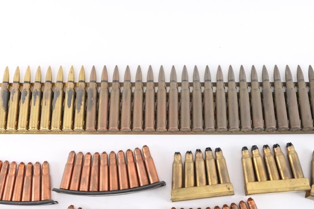 Approx. 270 rounds total. Approx. 122 ammunition blanks, some .303 British, 6.5 X 55mm & others. Possibly Chinese 7.62 X 39mm, most on stripper clips. Approx. 28 rounds of 7.7mm Nambu ammunition on stripper clip for Type 92 machine gun. Comes with partial tropical/jungle storage sleeve & approx. 120 rounds of 7.62 X 45mm military surplus factory new ammunition. All loose in zip lock bag.