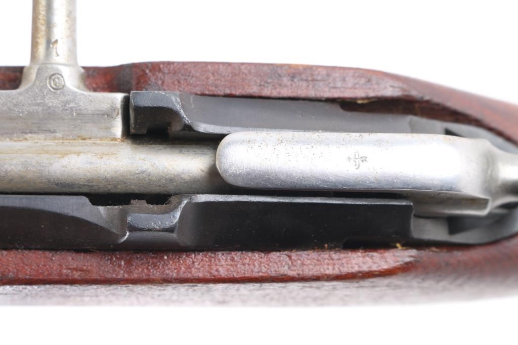 This is the rare M91/38 (Vz91/38) Czech Mosin-Nagant carbine made post war using M44 stocks. The stock has the bayonet cutout on the right side. Imperial Russian Izhevsk arsenal markings on the barrel shank along with a Czech star proof. Dated 1899. The hex receiver has Czech circled 'T' proof. Sources say there are only about 3000 produced. Left flat of hex receiver marked with '3', 'K'. Matching serial numbers on the barrel, floorplate, steel butt plate, and bolt. Wood has 3 small cartouches, including a star. 20' barrel. Bore is very good, strong rifling, very light frosting in the grooves, blue is about 92% with minor scratches/edge wear, a little finish loss on the barrel., wood is very good/sound, minor scratches/scuffs.