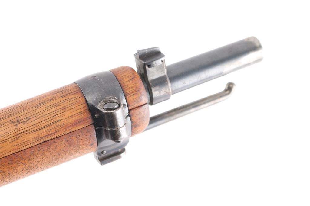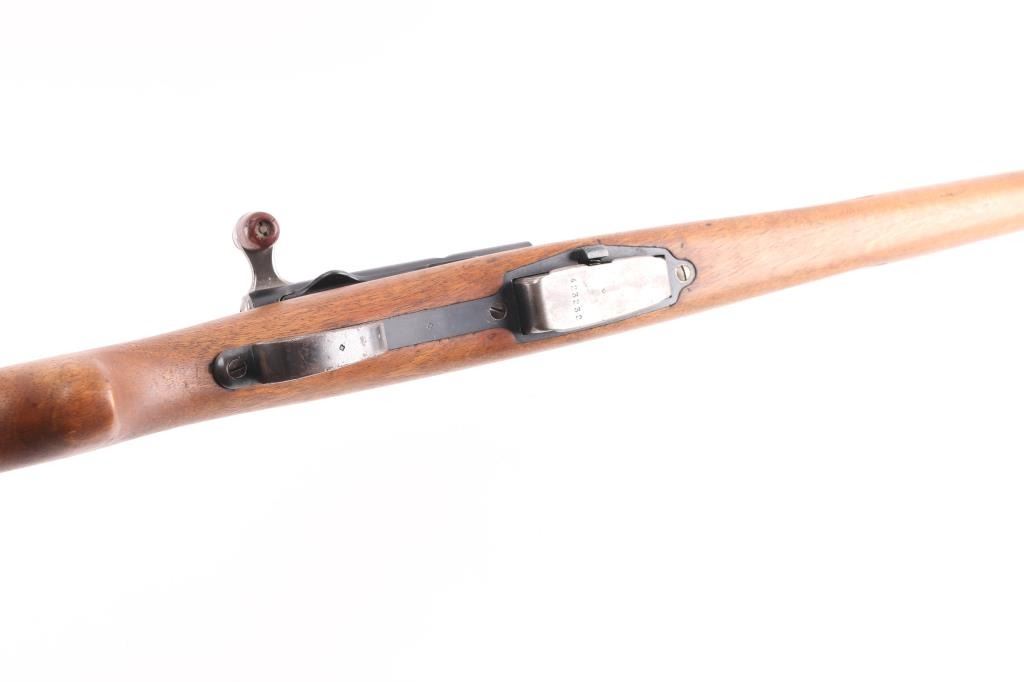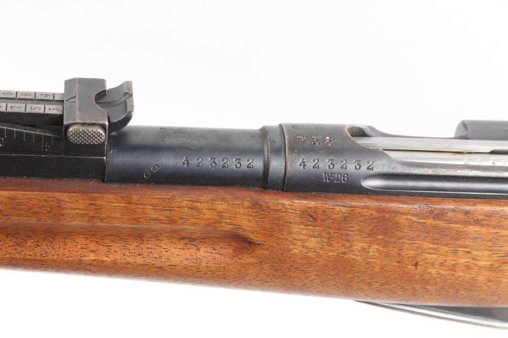 SN: 432232. Vintage Swiss Schmidt-Rubin military straight-pull bolt action service rifle features blued finish, 30.7" barrel, dovetailed patridge front sight, tangent style rear sight graduated to 2,000 meters, two barrel bands with a stacking hook & bayonet lug on the front band, smooth trigger, detachable 6 round magazine, synthetic red barrel shaped bolt handle, cocking ring, smooth wood handguard and full-length shoulder stock with finger grooved forend, partial pistol grip & smooth metal buttplate. Imported by PW Arms, marked on the left receiver. Privatized in 1956, with the Swiss soldier retaining it, left receiver stamped P-56. Serial numbers match on the receiver, barrel, bolt, and magazine. Swiss cross proofs, Bore is excellent/bright. Retains about 80% blue, with wear on the barrel, triggerguard, & magazine, bands. Wood is good solid condition with with some minor scratches/dings, action is smooth.