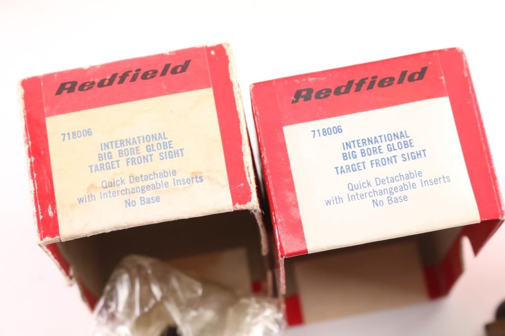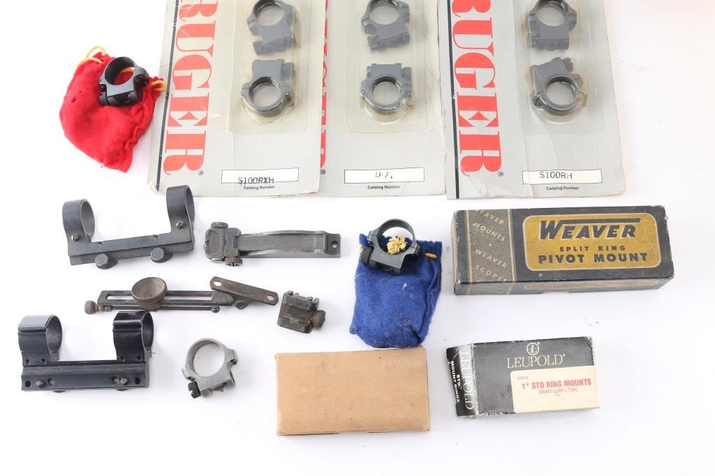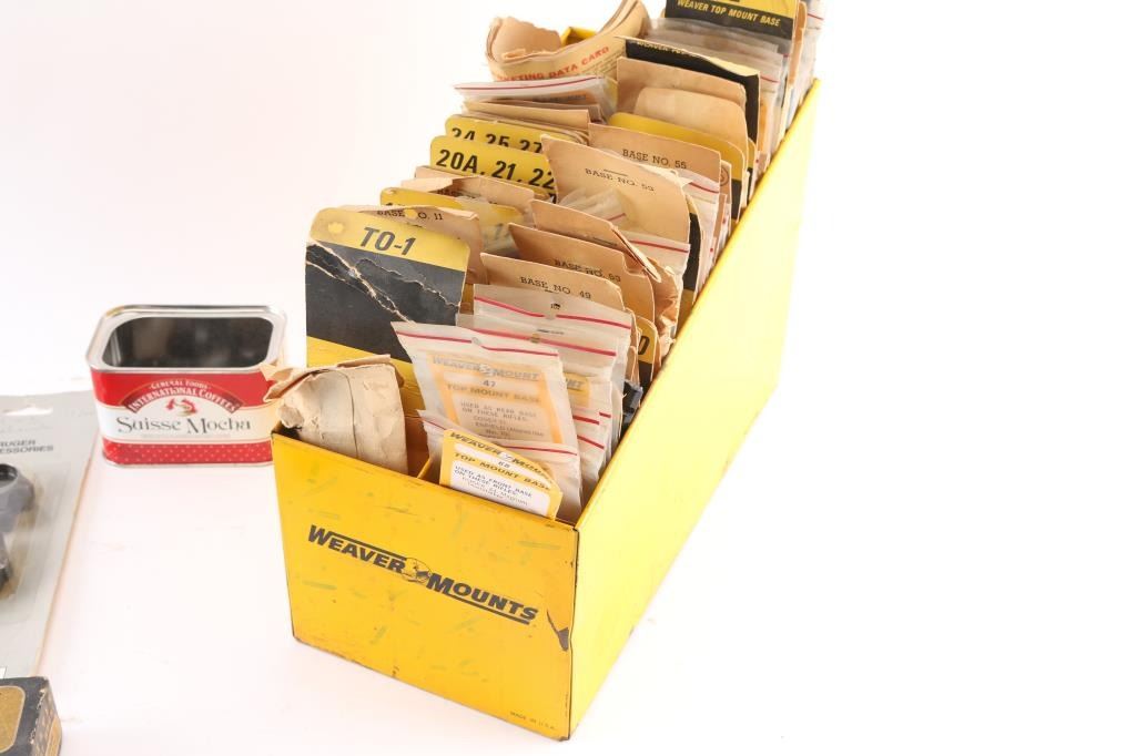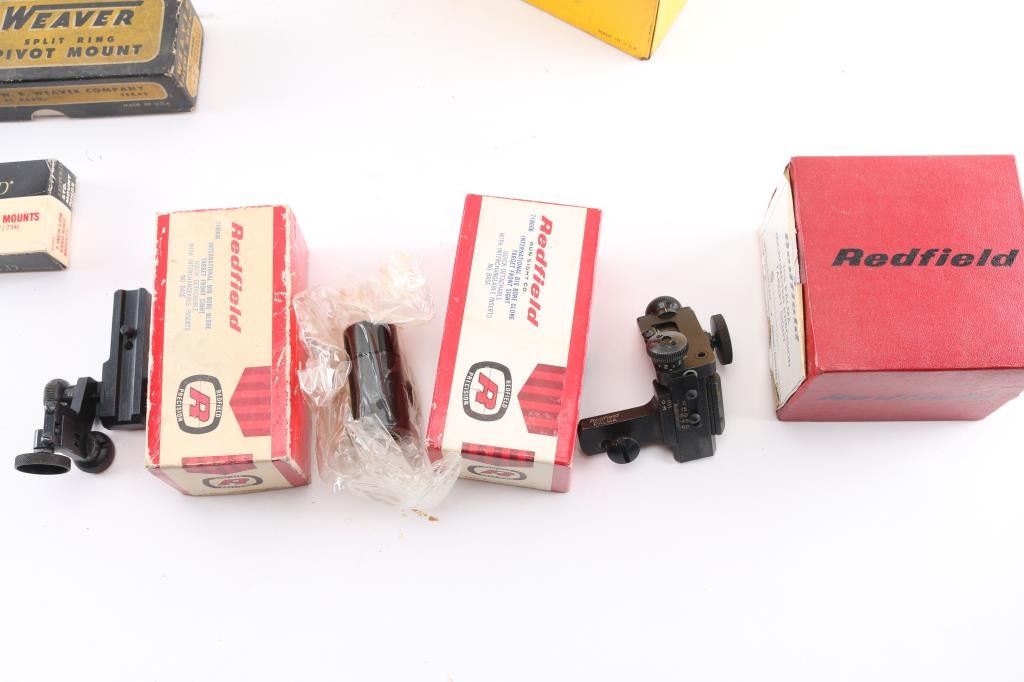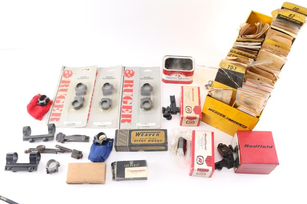 Includes over 50 factory new Weaver top mount bases for various firearms, Leupold & Ruger scope rings & Redfield & other brand sights. Most in factory packages.